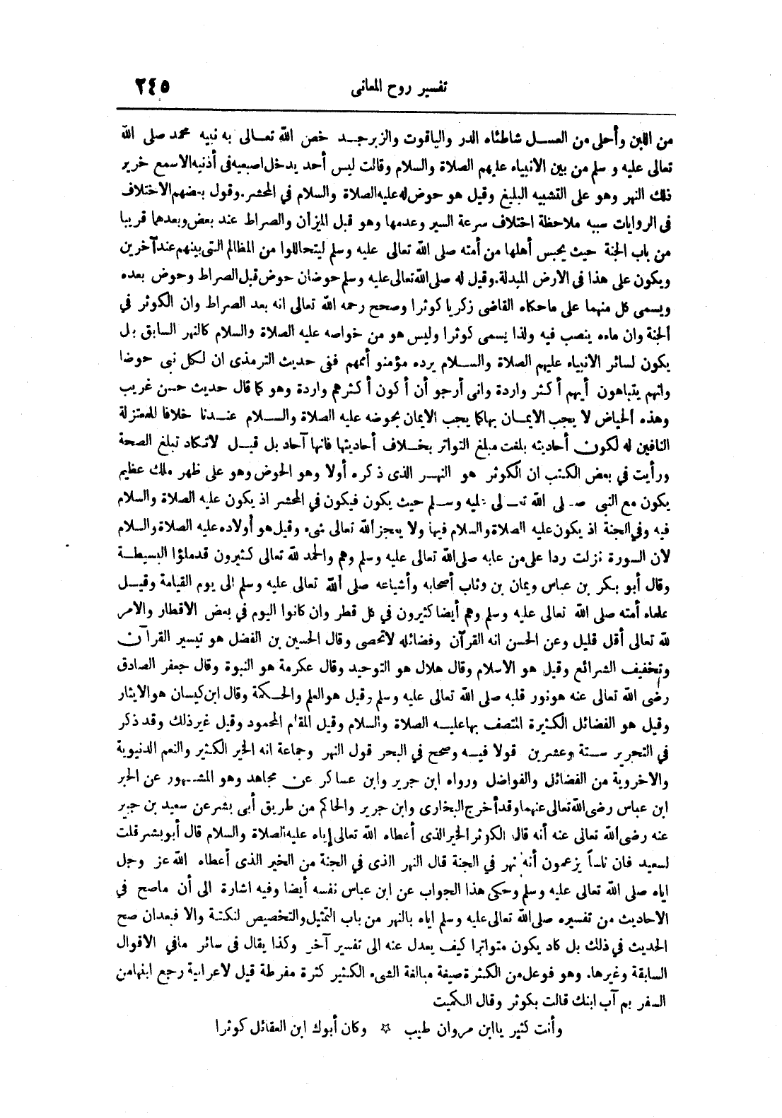 من اللبن وأحلى من العسل شاطئاه الدر والياقوت والزبرجد خص الله تعالى به نبيه محمد صلى الله تعالى عليه وسلم من بين الانبياء عليهم الصلاة والسلام وقالت ليس أحد يدخل اصبعيه في أذنيه الا سمع خرير ذلك النهر وهو على التشبيه البليغ وقيل هو حوض له عليه الصلاة و السلام في المحشر 0 وقول بعضهم الاختلاف في الروايات سببه ملاحظة اختلاف سرعة السير وعدمها وهو قبل الميزان والصراط عند بعض وبعدهما قريب من باب الجنة حيث يحبس أهلها من أمنه صلى الله تعالى عليه وسلم ليتحاللوا من المظالم التي بينهم عند آخرين ويكون على هذا في الارض المبدلة 0 وقيل له صلى الله تعالى عليه وسلم حوضان حوض قبل الصراط وحوض بعده ويسمى كل منهما على ماحكاه القاضي زكريا كوثرا وصحح رحمه الله تعالى انه بعد الصراط وان الكوثر في الجنة وان ماءه ينصب فيه ولذا يسمى كوثرا وليس هو من خواصه عليه الصلاة و السلام كالنهر السابق بل يكون لسائر الانبياء عليهم الصلاة والسلام يرده مؤمنو أممهم ففي حديث الترمذي ان لكل نبي حوضا وانهم يتباهون أيهم أكثر واردة واني أرجو أن أكون أكثرهم واردة وهو كما قال حديث حسن غريب وهذه الحياض لايجب الايمان بها كما يجب الايمان بحوضه عليه الصلاة و السلام عندنا خلافا للمعتزلة النافين له لكون أحاديثه بانت مبلغ التواتر بخلاف أحديثها فانها آحاد بل قيل لاتكاد تبلغ الصحة ورأيت في بعض الكتب ان الكوثر هو النهر الذي ذكره أولا وهوالحوض وهو على ملك عظيم يكون مع النبي صلى الله تعالى عليه وسلم حيث يكون فيكون في المحشر اذ يكون عليه الصلاة و السلام فيه في الجنة اذ يكون عليه الصلاة و السلام فيها ولايعجز الله تعالى شىء وقيل هو أولاده عليه الصلاة و السلام لان السورة نزلت ردا على من عابه صلى الله تعالى عليه وسلم وهم والحمد لله تعالى كثيرون قد ملؤا البسيطة وقال أبو بن عباس ويمان بن وثاب أصحابه وأشيائه صلى الله تعالى عليه وسلم الى يوم القيامة وقيل علماء أمته صلى اله تعالى عليه وسلم وهم أيضا كثيرون وفي كل قطر وان كانوا لداليوم في بعض الاقطار والامر لله تعالى أقل قليل وعن الحسن انه القرآن وفضائله لاتحصى وقال الحسين بن الفضل هو تيسير القرآن وتخفيف الشرائع وقيل هو الاسلام وقال هلال هو التوحيد وقال عكرمة هو النبوة وقال جعفر الصادق رضي الله تعالى عنه هو نور قلبه صلى الله تعالى عليه وسلم وقيل هو العلم والحكمة وقال ابن كيسان هو الايثار وقيل هو الفضائل الكثيرة المتصف بها عليه الصلاة و السلام وقيل المقام المحمود وقيل غير ذلك وقد ذكر في التحرير ستة وعشرين قولا فيه وصحح في البحر قول النهر وجماعة هو انه الخير الكثير والنعم الدنيوية والاخروية من الفضائل والفواضل ورواه ابن جرير وابن عساكر عن مجاهد وهو المشهور عن الحبر ابن عباس رضى الله تعالى عنهما وقد أخرج البخاري وابن جرير والحاكم من طريق أبي بشر عن سعيد بن جبير عنه رضى الله تعالى عنه أنه قال الكوثر الخير الذي أعطاه الله تعالى اياه عليه الصلاة و السلام قال أبو بشر قلت لسعيد فان ناسا يزعمون أنه نهر في الجنة قال النهر الذي في الجنة من الخير الذي أعطاه الله عز و جل اياه صلى الله تعالى عليه وسلم وحكم هذا الجواب عن ابن عباس نفسه أيضا وفيه اشارة الى أن ما صح في الاحاديث من تفسيره صلى الله تعالى عيه وسلم اياه بالنهر من باب التمثيل والتخصيص لنكتة والا فيعدان صح الحديث في ذلك بل كاد يكون متوترا كيف يعدل عنه الى التفسير آخر وكذا يقال في سائر ما في الاقوال السابقة وغيرها 0 وهو فوعل من الكثرة صيغة مبالغة اشىء الكثير كثرة مفرطة قيل لاعرابية رجع ابنها من السفر بم آب ابنك قالت بكوثر وقال الكميت وأنت كثير ياابن مروان طيب