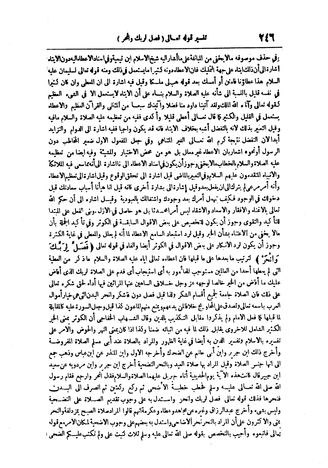 وفي حذف موصوفه مالا يخفى من المبالغة على ماأشار اليهه شيخ الاسلام ابن تميمة وفي اسناد الاعطاء اليه دون الايتاء اشارة الى أن ذلك أيتاء على جهة التمليك فان الاعطاء دونه كثيرا مايستعمل في ذلك ومنه تعالى لسليمان عليه السلام هذا عطاؤنا فامن أو أمسك بعد قوله هب لي ملكا وقيل فيه اشارة الى المعطى وان كان كثيرا في نفسه قليل بالنسبة الى شأنه عليه الصلاة و السلام بناء على أن الايتاء لايستعمل الا في الشىء العظيم كقوله تعالى وآتاه الله الملك ولقد آتينا داود منا فضلا وآتيناك سبعا من المثاني والقرآن الععظيم والاعطاء يستعمل في القليل والكثير كما قال تعالى أعطى قليلا وأكدى ففيه من تعظيمه عليه الصلاة و السلام مافيه وقيل والتعبير بذلك لانه بالتفضل أشبه بخلاف الايتاء فانه قد يكون واجبا ففيه اشارة الى الدوام والتزايد أبدا لان التفضل نتيجة كرم الله تعالى الغير متناهي وفي جعل المفعول الاول ضمير المخاطب دون الرسول أو نحوه اشعار بأن الاعطاء غير معلل بل هو من محض الاختيار والمشيئة وفيه أيضا من تعظيمه عليه الصلاة و السلام بالخطاب ما لايخفى وجوز أن يكون في أسناد الاعطاء الى نا اشارة الى أنه مما سعى فيه الملائكة والانبياء المتقدمون عليهم السلام وفي التعبير بالماضي قيل اشارة الى تحقق الوقوع وقيل اشارة الى تعظيم الاعطاء وأنه أمر مرعى لم يترك الى أن يفعل بعد وقيل اشارة الى بشارة أخرى كانه قيل انا هيأنا أسباب سعادتك قبل دخولك في الوجود فكيف نهمل أمرك بعد وجودك واشتغالك بالعبودية وقيل اشارة الى أن حكم الله تعالى بالاغناء والافقار والاسعاد والاشقاء لبس أمرا محدثا بل هو حاصل في الازل 0 وبنى الفعل على المبتدأللتأكيد والتقوي وجوز أن يكون للتخصيص على بعض الاقوال السابقة في الكوثر وفي تأكيد الجملة بأن ما لايخفى من الاعتناء بشأن الخبر وقيل لرد استعباد السامع الاعطاء الما أنه الم يعلل والمعطى في غاية الكثرة وجوز أن يكون لرد الانكار على بعض الاقوال في الكوثر والفاء في قوله تعالى فصل لربك وأنحر لترتيب مابعدها على ماقبلها فان اعطاءه تعالى أياه عليه الصلاة و السلام ماذكر من العطية التي لم يعطها أحدا من العالمين مستوجب للمأمور به أي أستيجاب أي فدم على الصلاة لربك الذي أفاض عليك مالأفاض من الخير خالصا لوجهه عز و جل خلاف الساهين عنها المرائين فيها أداء لحق شكره تعالى على ذلك فان الصلاة جامعة لجميع أقسام الشكر ولذا قيل فصل دون فاشكر وانحر وانحر البدن التي هي خيار أموال العرب باسمه تعالى تصدق على المحاويج خلافا لمن يدعهم ويمنع منهم الماعون كذا قيل وجعل السورة عليه كالمقابلة لما قبلها كما فعل الامام وام يذكروا مقابل التكذيب بالدين وقال الشهاب الخفاجي أن الكوثر بمعنى الخير الكثير الشامل للاخروى يقابل ذلك الما فيه من اثباته ضمنا وكذا اذا كان بمعنى النهر والحوض واللامر على تفسيره بالاسلام وتفسير الدين به أيضا في غاية الظهور والمراد بالصلاة عند أبي مسلم الصلاة المفروضة وأخرج ذلك أبن جرير وابن أبي حاتم عن الضحاك وأخرجه الاول وابن المنذر عن ابن عباس وذهب جمع الى انها جنس الصلاة وقيل المراد بها صلاة العيد وبالنحر التضحية أخرج بن جرير وابن مردويه عن سعيد ابن جبير قال كانت هذه الآية يوم الحديبية أتاه جبريل عليه الصلاة و السلام فقال انحر وارجع فقام رسول اله صلى الله تعالى عليه وسام فخطب خطبة الاضحى ثم ركع ركعتين ثم انصرف الى البدن فنحرها فذلك قوله تعالى فصل لربك وانحر واستدل به على وجوب تقديم الصلاة على التضحية وليس بشيء وأخرج عبد الرزاق وغيره عن مجاهد وعطاء عكرمة أنهم قالوا المراد صلاة الصبح بمزدلفة والنحر بمنى والاكثرون على أن المراد بالنحر نحر الاضاحي واستدل به بعضهم على وجوب للاضحية لمكان الامر مع قوله تعالى فاتبعوه وأجيب بالتخصص بقوله صلى الله تعالى عليه وسلم ثلاث كتبت علي ولم تكتب عليكم الضحى