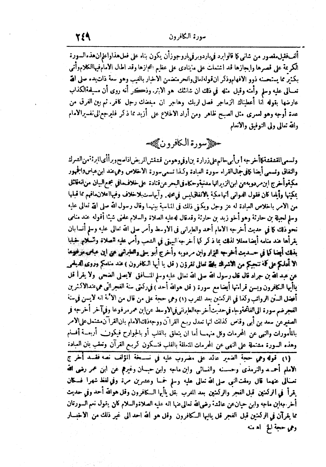 وهي عند أبي عباس والجمهور مكية وأخرج ابن مردويه عن ابن الزبير انها مدنية وحكاه في البحر عن قتادة على خلاف مافي مجمع البيان من انه قائل بمكيتها وأياما كان قول الدواني أنها مكية بالاتفاق ليس في محله 0 وآيها ست بلا خلاف وفيها اعلان مافهم مما قللها من الامر باخلاص العبادة له عز و جل ويكفي ذلك في المناسبة بينهما وقال رسول الله صلى الله تعالى عليه وسلم لجبلة بن حارثة وهوأخو زيد بن حارثة وقد قال له عليه الصلاة و السلام علمني شيئا أقوله عند منامي نحو ذلك كما في حديث أخرجه الامام أحمد والطبراني في الاوسط وأمر صلى الله تعالى عليه وسلم أنسا بأن يقرأها عند منامه أيضا معللا لذلك بما ذكر كما أخرجه البيهقي في الشعب وأمر عليه الصلاة و السلام خبابا بذلك أيضا كما في حديث أخرجه البزار وابن مردويه وأخرج أبو يعلى والطبراني عن أبن عباس مرفوعا الا أدلكم على كلمة تنجيكم من الاشراك بالله تعالى تقرؤن قل يأيها الكافرون عند منامكم وروى الديلمي عن عبد اله بن جراد قال قال رسول الله صلى الله تعالى عليه وسلم المنافق لايصلي الضحى ولايقرأ قل ياأيها الكافرون ويسن قراءتها أيضا مع سورة قل هو الله أحد في ركعتي سنة الفجر التي هي عند الاكثرين أفضل السنن الرواتب وكذا في الركعتين بعد المغرب وهي حجة على من قال منن الائمة انه لايسن في سنة الفجر ضم سورة الى الفاتحة وجاء في حديث أخرجه الطبراني في الاوسط عن ابن عمر مرفوعا وفي آخر أخرجه الصغير عن سعد بن أبي وقاص كذلك انها تعدل ربع القرآن ووجه ذلك الامام بان القرآن مشتمل على الامر بالمأمورات والنهي عن المحرمات وكل منهما أما ان يتعلق بالقلب أو الجوارح فيكون أربعة أقسام وهذه السورة مشتملة على النهى عن المحرمات المتعلقة بالقلب فتكون كربع القرآن وتعقب بأن العبادة