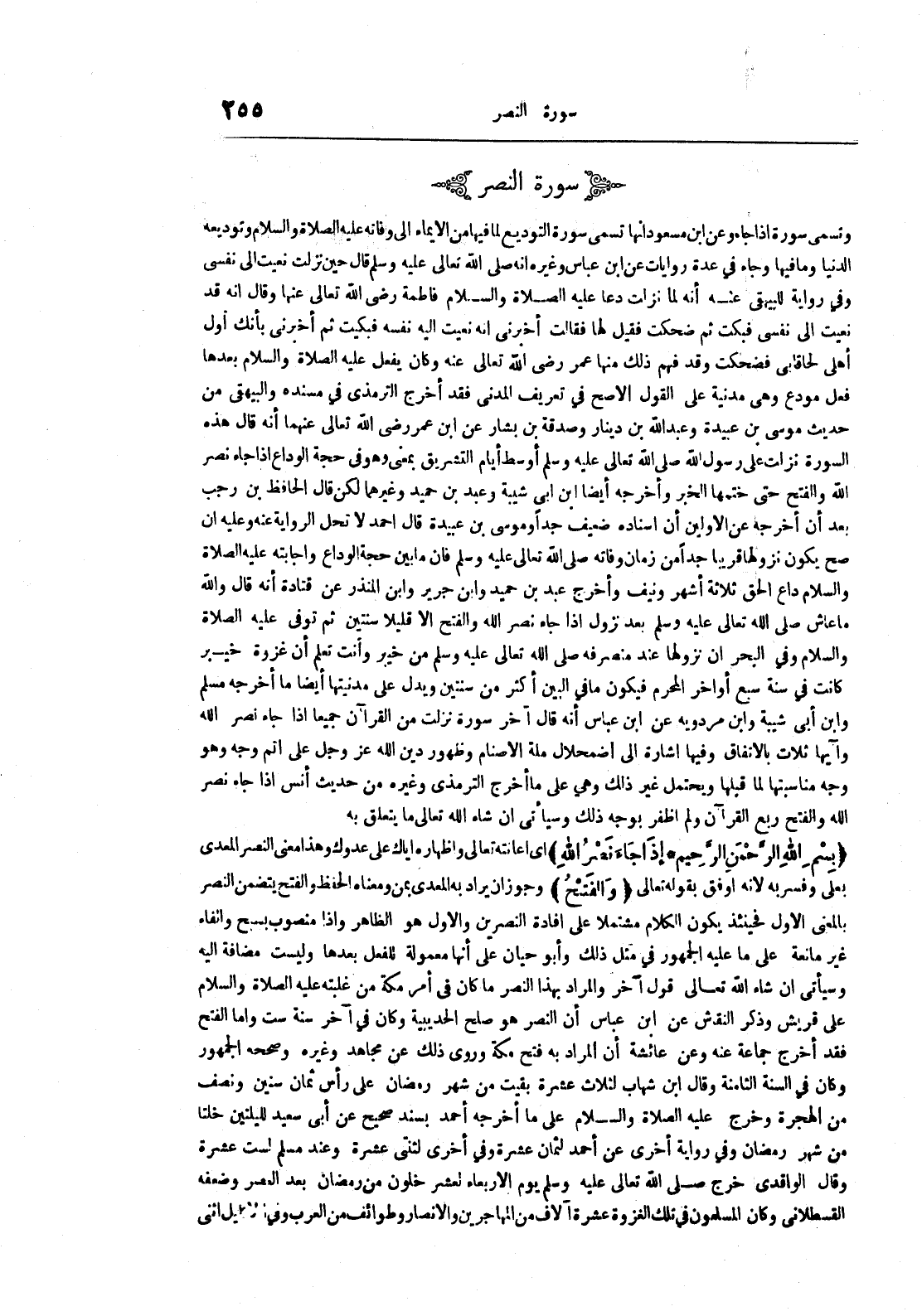 وتسمى سورة أذا جاء وعن ابن مسعود انها تسمى سورة التوديع لما فيها من الايماء الى وفاته عليه الصلاة و السلام وتوديعه الدنيا وما فيها وجاء في عدة روايات عن ابن عباس وغيره أنه صلى الله تعالى عليه وسلم قال حين نزلت نعيت الى نفسى وفى رواية البيهقى عنه أنه لما نزلت دعا عليه الصلاة و السلام فاطمة رضى الله تعالى عنها وقال انه قد نعيت الى نفسى فبكت ثم ضحكت فقيل لها فقالت أخبرنى انه نعيت اليه بنفسه فبكيت ثم أخبرنى بأنك أول أهلى لحاقا بى فضحكت وقد فهم ذلك منها عمر رضى الله تعالى عنه وكان يفعل عليه الصلاة و السلام بعدها فعل مودع وهى مدنية على القول الاصح في تعريف المنى فقد أخرج الترمذى في مسنده والبيهقى من حديث موسى بن عبيدة وعبد الله بن دينار وصدقة بن بشار عن ابن عمر رضى الله تعالى عنهما أنه قال هذه السورة نزلت على رسول الله صلى الله تعالى عليه وسام أوسط أيام التشريق بمعنى وهو في حجة الوداع اذا جاء نصر الله والفتح حتى ختمها الخبر وأخرجه أيضا ابن أبى شيبة وعبد بن حميد وغيرهما لكن قال الحافظ بن رجب بعد أن أخرجه عن الاولين أن اسناده ضعيف جدا وموسى بن عبيدة قال احمد لاتحل الرواية عنه وعليه ان صح يكون نزولها قريبا جدا من زمان وفاته صلى الله تعالى عليه وسلم فان مابين حجة الوداع واجابته عليه الصلاة و السلام داع الحق ثلاثة أشهر ونيف وأخرج عبد بن حميد وابن جرير وابن المنذر عن قتادة أنه قال والله ماعاش صلى الله تعالى عليه وسلم بعد نزول اذا جاء نصر الله والفتح قليلا سنتين ثم توفى عليه الصلاة و السلام وفي البحر ان نزولها عند منصرفه صلى الله تعالى عليه وسلم من خيبر وأنت تعلم أن غزوة خيبر كانت فى سنة سبع أواخر المحرم فيكون مافى البين أكثر من سنتين ويدل على مدنيتها أيضا ماأخرجه مسلم وابن شيبة وابن مردويه عن ابن عباس أنه قال خر سورة نزلت من القرآن جميعا اذا جاء نصر الله وآيها ثلاث بالاتفاق وفيها اشارة الى اضمحلال ملة الاصنام وظهور دين الله عز و جل على اتم وجه وهو وجه مناسبتها لما قبلها ويحتمل غير ذلك وهى على مأخرج الترمذى وغيره من حديث أنس اذا جاء نصر الله والفتح ربع القرآن ولم اظفر بوجه ذلك وسيأتى ان شاء الله تعالى مايتعلق به بسم الله الرحمن الرحيم