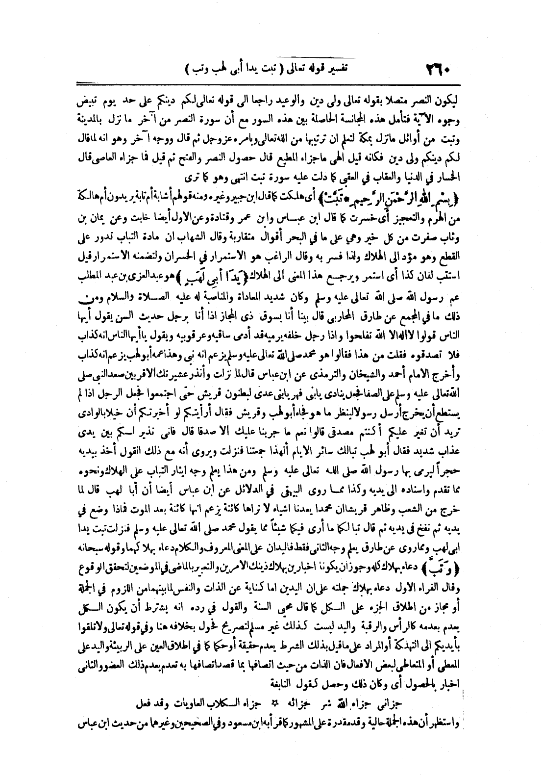 ليكون النصر متصلا بقوله تعالى ولى دين والوعيد راجعاالى قوله تعالى لكم دينكم على حد يوم تبيض وجوه الآية فتأمل هذه المجانسة الحاصلة بين هذه السور مع أن سورة النصر من آخر مانزل بالمدينة وتبت من من أوائل مانزل بمكة لتعلم ان ترتيبها من الله تعالى وبامره عز و جل ثم قال ووجه آخر وهو انه لما قال لكم دينكم ولى دين فكانه قيل الهى ما جزاء المطيع قال حصول النصر والفتح ثم قيل فما جزاء العاصى قال الخسار فى الدنيا والعقاب فى العقبى كما دلت عليه سورة تبت انتهى وهو كما ترى بسم اله الرحمن الرحيم
