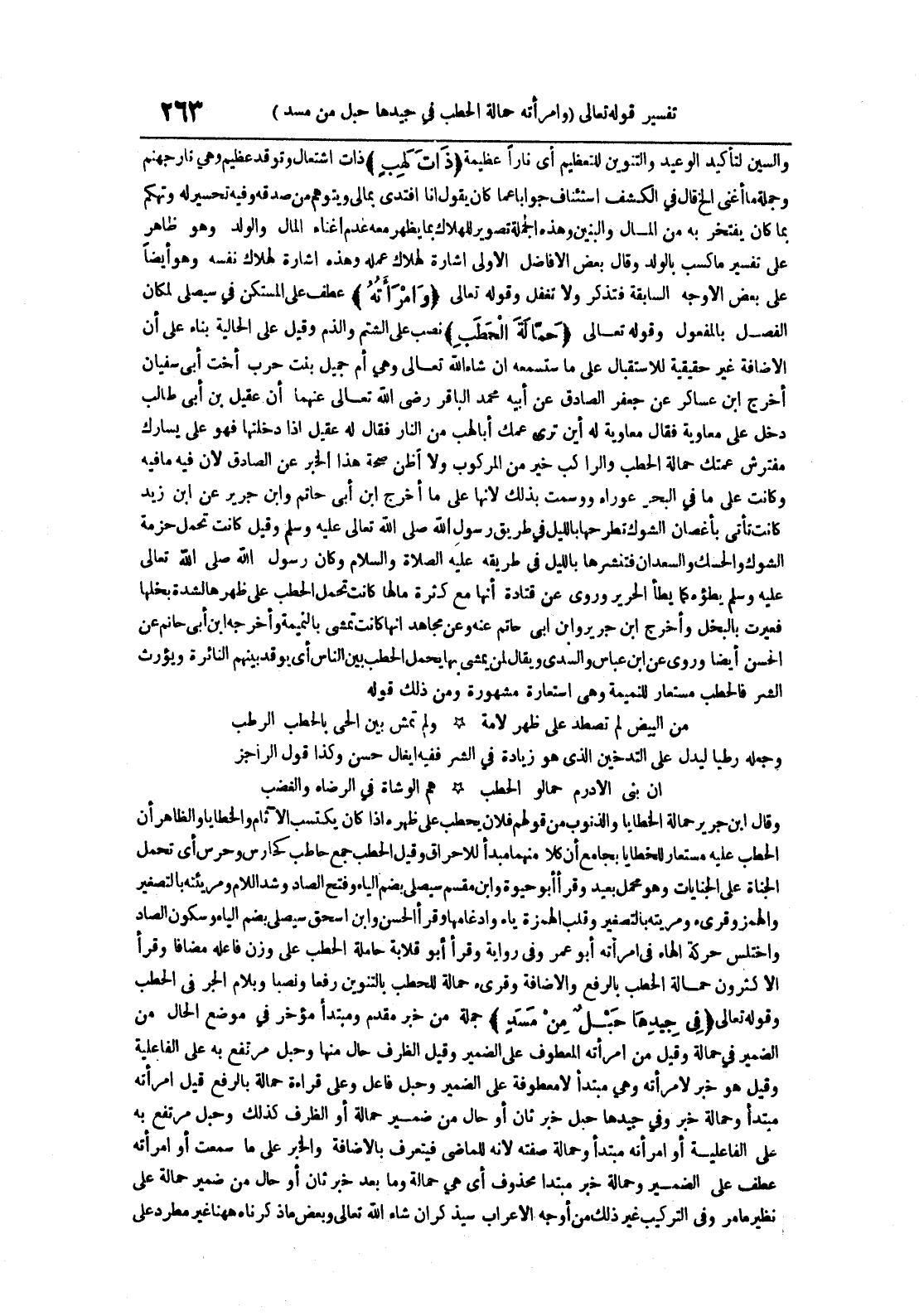 هم الوشاة فى الرضاء والغضب وقال ابن جرير حمالة الخطايا واذنوب من فلان يحطب على ظهره اذا كان يكتسب الآثام والخطايا والظاهر ان الحطب عليه مستعار للخطايا بجامع أن كلا مبدأ للاحراق وقيل الحطب جمع حاطب جمع حارس وحرس أى تحمل الجناة على الجنايات وهومحمل بعيد وقر أبو حيوة وابن مقسم سيصلى بضم الياء وفتح الصاد وشد اللام ومريئته بالتصغير والهمز وقرىء ومريته بالتصغير وقاب الهمزة ياء وادغامها وقرأ الحسن وابن اسحق سيصلى بضم الياء وسكون الصاد واختلس حركة الهاء فى أمرأته أبو عمر وفى رواية وقرأ أبو قلابة حاملة الحطب على وزن فاعله مضافا وقرأ الاكثرون حمالة الحطب بالرفع والاضافة وقرىء حمالة للحطب بالتنوين رفعا ونصبا وبلام الجر فى الحطب وقوله تعالى فى جيدها حبل من مسد جملة من خبر مقدم ومبتدأ مؤخر فى موضع الحال من الضمير فى حمالة وقيل من أمرأته المعطوف على الضمير وقيل الظرف حال منها وحبل مرتفع به على الفاعلية وقيال هو خبر لامرأته وهى مبتدأ لامعطوفة على الضمير وحبل فاعل وعلى قراءة حمالة بالرفع وقيل امرأته مبتدأ وحمالة خبر وفى جيدها حبل خبر ثان أو حال من ضمير حمالة أو الظرف كذلك وحبل مرتفع به على الفاعلية أو امرأته عطف على الضمير وحمالة خبر مبتدأ محذوف أى هي حمالة وما بعد خبر ثان أو حال من ضمير حمالة على نظير مامر وفى التركيب غير ذلك من أوجه الاعراب سيذكر ان شاء الله تعالى وبعض ماذكرناه ههنا غير مطرد على