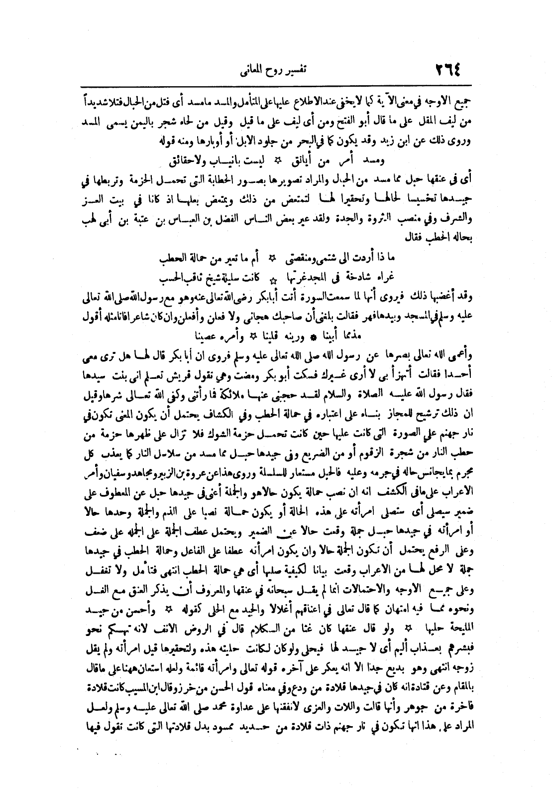 وأمره عصينا وأعمى الله تعالى بصرها عن رسول الله صلى تعالى عليه وسلم فروى أن أبا بكر قال لها هل ترى معى أحدا فقالت أتهزأ بى لاأرى غيرك فسكت أبو بكر ومضت وهى تقول قريش تعلم انى بنت سيدها فقال رسول الله عليه الصلاة و السلام لقد حجبنى عنها ملائكة فما رأتنى وكفى الله تعالى شرها وقيل ان ذلك ترشيح للمجاز بناء على اعتباره فى حمالة الحطب وفى الكشاف يحتمل أن يكون المعنى تكون فى نار جهنم على الصورة التى كانت عليها حين كانت تحمل حزمة الشوك فلا تزال على ظهرها حزمة من حطب النار من شجرة الزقوم أو من الضريع وفي جيدها حبل مما مسد من سلاسل النار كما يعذب كل مجرم بما يجانس حاله فى جرمه وعيه فالحبل مستعار للسلسلة وروى هذا عن عروة بن الزبير ومجاهد وسفيان وأمر الاعراب على مافى الكشف انه أن نصب حمالة يكون حالا هو والجملة أعنى فى جيدها حبل علعن المعطوف على ضميلر سيصلى أى ستصلى امرأته على هذه الحالة أو يكون حمالة نصبا على الذم والجملة وحدها حالا أو امرأته فى جيدها حبل جملة وقعت حالا عن الضمير ويحتمل عطف الجملة على الجملة على ضعف وعلى الرفع يحتمل أن تكون الجملة حالا وان يكون امرأته عطفا على الفاعل وحمالة الحطب فى جيدها جملة لامحل لها من الاعراب وقعت بيانا لكيفية صليها أى هى حمالة الحطب انتهى فتأمل ولاتغفل وعلى جميع الاوجه والاحتمالات انما لم يقل سبحانه فى عنقها والمعروف أن يذكر العنق مع الغل ونحوه مما فيه امتهان كما قال تعالى فى اعناقهم أغلالا والجيد مع الحلى كقوله