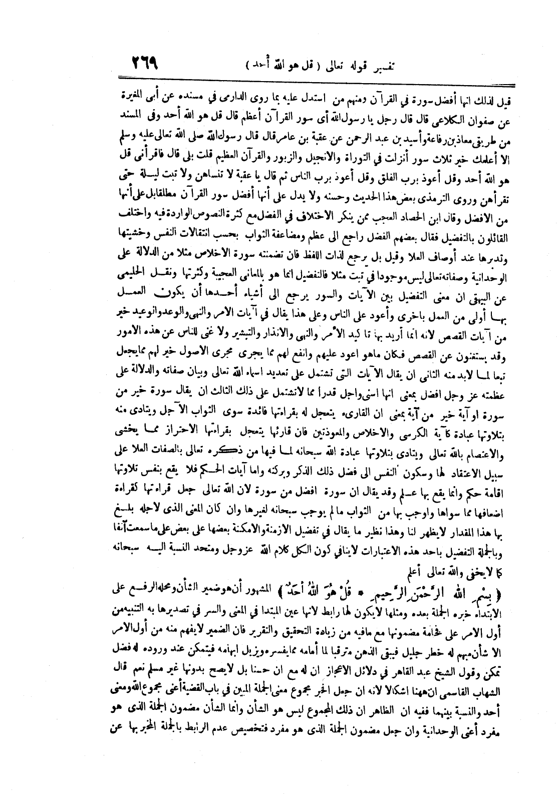 قيل لذلك انها أفضل سورة فى القرآن ومنهم من استدل عليه بما روى الدارمى فى مسنده عن أبى المغيرة عن صفوان الكلاعى قال قال رجل يارسول الله أى سور القرآن أعظم قال قل هو الله أحد وفى المسند من طريقى معاذ بن رفاعة وأسيد بن عبد الرحمن عن عقبة بن عامر قال قال رسول الله صلى الله تعالى عليه وسلم الا أعلمك خير ثلاث سور أنزلت فى التوراة والانجيل والزبور والقرآن العظيم قلت بلى قال فاقرأنى قل هو الله أحد وقل أعوذ برب الفلق وقل أعوذ برب الناس ثم قال ياعقبة لاتنساهن ولاتبت ليلة حتى تقرأهن وروى الترمذى بعض هذا الحديث وحسنه ولايدل على أنها أفضل سور القرآن مطلقا بل على أنها من الافضل وقال ابن الحصاد العجب ممن ينكر الاختلاف فى الفضل مع كثرة النصوص الواردة فيه واختلف القائلون بالتفضيل فقال بعضهم الفضل راجع الى عظم ومضاعفة الثواب بحسب انتقالات النفس وخشيتها وتدبرها عند أوصاف العلا وقيل بل يرجع لذات اللفظ فان تضمنته سورة الاخلاص مثلا من الدلالة على الوحدانية وصفاته تعالى ليس موجودا فى تبت مثلا فالتفضيل انما هو بالمعانى العجيبة وكثرتها ونقل الحليمى عن البيهقى ان معنى التفضيل بين الآيات والسور يرجع الى أشياء أحدها أن يكون العمل بها أولى من العمل باخرى واعود على الناس وعلى هذا يقال فى آيات الامر والنهى والوعد والوعيد خير من آيات القصص لانه انما أريد بها تأكيد الأمر والنهى الانذار والتنشير ولاغنى للناس عن هذه الامور وقد يستغنون عن القصص فكان ماهو اعود عليهم وانفع لهم مما يجرى مجرى الاصول خير لهم مما يجعل تبعا لما لابد منه الثانى ان يقال الآيات التى تشتمل على تعديد اسماء الله تعالى وبيان صفاته والدلالة على عظمته عز و جل افضل بمعنى انها واجل قدرا مما لاتشتمل على ذلك الثالث لن يقال سورة خير من سورة أو آية خير من آية بمعنى ان القارىء يتعجل له بقراءتها فائدة سوى الثواب الآجل وبتادى منه بتلاوتها عبادة كآية الكرسى والاخلاص والمعوذتين فان قارئها يتعجل بقراءتها الاحتراز مما يخشى والاعتصام بالله تعالى ويتادى بتلاوتها عبادة الله سبحانه لما فيها من ذكره تعالى بالصفات العلا على سبيل الاعتقاد لها وسكون النفس الى فضل ذلك الذكر وبركته واما آيات الحكم فلا يقع بنفس تلاوتها اقامة حكم وانما يقع بها علم وقد يقال ان سورة افضل من سورة لان الله تعالى جعل قراءتها كقراءة اضعافها مما سواها واوجب بها من الثواب ما لم يوجب سبحانه لغيرها وان كان المعنى الذى لاجله بلغ بها هذا المقدار لايظهر لنا وهذا نظير مايقال فى تفضيل الازمنة والامكنة بعضها على بعض على ماسمعت آنفا وبالجملة التفضيل باحد هذه الاعتبارات لاينافى كون الكل كلام الله عز و جل ومتحد النسبة اليه سبحانه كما لايخفى والله تعالى أعلم 0 بسم الله الرحمن الرحيم