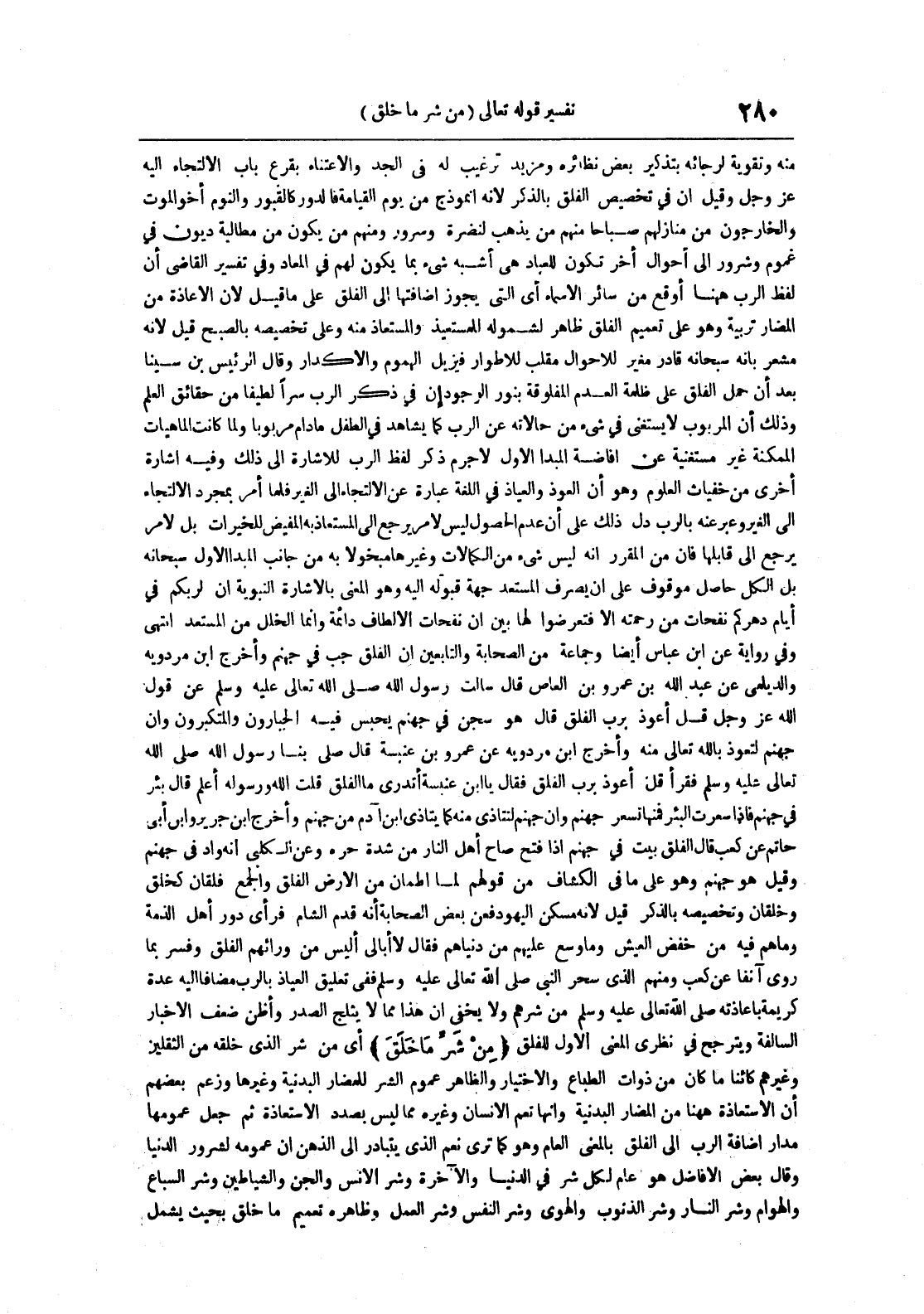 منه وتقوية لرجائه بتذكير بعض نظائره ومزيد ترغيب له فى الجد والاعتناء بقرع باب الالتجاء اليه عز و جل وقيل أن فى تخصيص الفلق بالذكر لانه انموذج من يوم القيامة فالدور كالقبور والنوم أخو الموت والخارجون من منازلهم صباحا منهم من يذهب لنضرة وسرور ومنهم من يكون من مطالبة من ديون فى غموم وشرور الى أحوال أخر تكون للعباد هى أشبه شىء بما يكون لهم فى المعاد وفى تفسير القاضى أن لفظ الرب ههنا أوقع من سائر الاسماء أى التى يجوز أضافتها ال الفلق عالى ماقيل لان الاعاذة من المضار تربية وهو على تعميم الفلق ظاهر لشموله للمستعيذ والمستعاذ منه وعلى تخصيصه بالصبح قيل لانه مشعر بانه سبحانه قادر مغير للاحوال مقلب للاطوار فيزيل الهموم والاكدار وقال الرئيس أبن سينا بعد أن حمل الفلق على ظلمة العدم المفلوقة بنور الوجود ان فى ذكر الرب سرا لطيفا من حقائق العلم وذلك أن المربوب لايستغنى فى شىء من حالاته عن الرب كما يشاهد فى الطفل مادام مربوبا ولما كانت الماهيات الممكنة غير مستغنية عن أضافة المبدأ الأول لاجرم ذكر لفظ الرب للاشارة الى ذلك وفيه أشارة أخرى من خفيات العلوم وهو أن العوذ والعياذ فى اللغة عبارة عن الالتجاء الى الغير فلما أمر بمجرد الالتجاء الى الغير وعبر عنه بالرب دل ذلك على أن عدم الحصول ليس بأمر يرجع الى المستعاذ به المفيض للخيرات بل لامر يرجع الى قابلها فان من المقرر انه ليس شىء من الكمالات وغيرها مبخولا به من جانب المبدأ الأول سبحانه بل الكل حاصل موقوف على ان يصرف المستعذ جهة قبوله اليه وهو المعنى بالاشارة النبوية ان لربكم فى أيام دهركم نفحات من رحمته الا فتعرضوا لها بين ان نفحات الالطاف دائمة وانما الخلل من المستذ انتهى وفى رواية عن ابن عباس أيضا وجماعة من الصحابة والتابعين ان الفلق جب فى جنهم وأخرج ابن مردويه والديلمى عن عبد الله بن عمرو بن العاص قال سألت رسول الله صلى الله تعالى عليه وسلم عن قول الله عز و جل قل أعوذ برب الفلق قال هو سجن فى جهنم يحبس فيه الجبارون والمتكبرون وان جهنم لتعوذ بالله تعالى منه وأخرج بن مردويه عن عمر بن عنبسة قال صلى الله تعالى عليه وسلم فقرأ قل أعوذ برب الفلق فقال ياأبن عنبسة أتدري ما الفلق قلت الله ورسوله أعلم قال بئر فى جهنم فاذا سعرت البئر فمنها تسعر جهنم لتتاذى منه كما يتاذى ابن آدم من جهنم وأخرج جرير وأبن أبى حاتم عن كعب قال الفلق بيت فى جهنم اذا فتح صاح أهل النار من شدة حره وعن الكلبى أنه واد فى جهنم وقيل انه هو جهنم وهو على مافى الكشاف من قولهم لما اطمأن من الارض الفلق والجمع فلقان كخلق وخلقان وتخصيصه بالذكر قيل لانه مسكن اليهود فعن بعض الصحابة أنه قدم الشام فرأى دور أهل الذمة وماهم من خفض العيش وما وسع عليهم من دنياهم فقال لاأبالى أليس من ورائهم الفلق وفسر بما روى آنفا عن كعب ومنهم الذى سحر النبى صلى الله تعالى عليه وسلم ففى تعليق العياذ بالرب مضافا اليه عدة كريمة باعاذته صلى الله تعالى عليه وسلم من شرهم ولايخفى ان هذا مما لايثلج الصدر وأظن ضعف الاخبار السالفة ويترجح نظرى المعنى الاول للفلق من شر ماخلق أى من شر الذى خلقه من الثقلين وغيرهم كائنا ماكان من ذوات الطباع والاختيار والظاهر عموم الشر للمضار البدنية وغيرها وزعم بعضهم أن الاستعاذة ههنا من المضار البدنية وانها تعم الانسان وغيره مما ليس بصدد الاستعاذة ثم جعل عمومها مدار أضافة الرب الى الفلق بالمعنى العام وهو كما ترى نعم الذى يتبادر الى الذهن ان عمومه لشرور الدنيا وقال بعض الافاضل هو عام لكل شر فى الدنيا والآخرة وشر الأنس والجن والشيطين وشر السباع والهوام وشر النار وشر الذنوب والهوى وشر النفس وشر العمل وظاهره تعميم ما خلق بحيث يشمل
