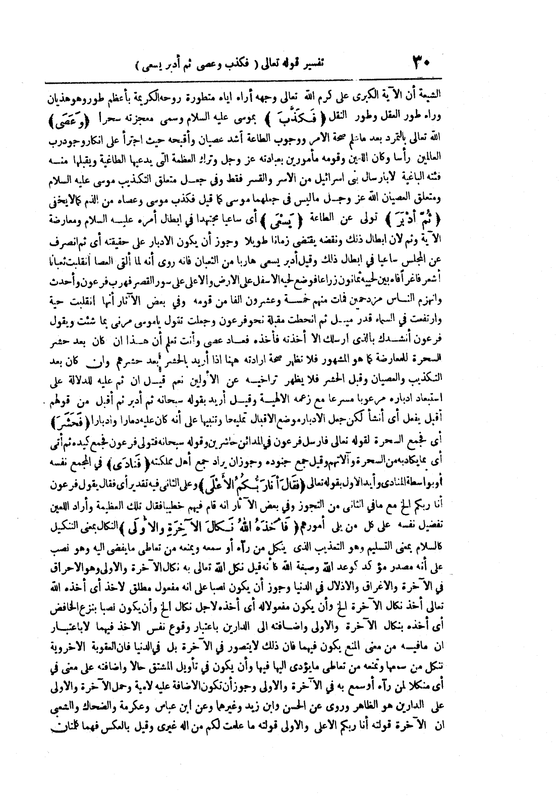 الشيعة أن الآية الكبرى علي كرم الله تعالى وجهه أراه إياه متطورة روحه الكريمة بأعظم طور وهو هذيان وراء العقل وطور النقل فكذب بموسى عليه السلام وسمى معجزته سحرا وعصى الله تعالى بالتمرد بعد ما علم صحة الأمر ووجوب الطاعة أشد عصيان وأقبحه حيث اجترأ على إنكار وجود رب العالمين رأسا وكان اللعين وقومه مأمورين بعبادته عز و جل وترك العظمة التي يدعيها الطاغية ويقلبها منه فئته الباغية لا بإرسال بني إسرائيل من الأسر والقسر فقط وفي جعل متعلق التكذيب موسى عليه السلام ومتعلق العصيان الله عز و جل ما ليس في جعلهما موسى كما قيل فكذب موسى وعصاه من الذم كما لا يخفى ثم أدبر تولى عن الطاعة يسعى أي ساعيا مجتهدا في إبطال أمره عليه السلام ومعارضة الآية وثم لأن إبطال ذلك ونقضه يقتضي زمانا طويلا وجوز أن يكون الدبار على حقيقته أي ثم انصرف عن المجلس ساعيا في إبطال ذلك وقيل أدبر يسعى هاربا من الثعبان فإنه روي أنه لما ألقى العصا انقلبت ثعبانا أشعر فاغرا فاه بين لحييه ثمانون زراعا فوضع لحيه الأسفل على الأرض والأعلى على سور القصر فهرب فرعون وأحدث وانهزم الناس مزدحمين فمات منهم خمسة وعشرون ألفا من قومه وفي بعض الآثار أنها انقلبت حية وارتفعت في السماء قدر ميل ثم انحطت مقبلة نحو فرعون وجعلت تقول يا موسى مرني بما شئت يقول فرعون أنشدك بالذي أرسلك إلا أخذته فأخذه فعاد عصى وأنت تعلم أن هذا إن كان بعد حشر السحرة للمعارضة كما هو المشهور فلا تظهر صحة إرادته ههنا إذا أريد بالحشر بعد حشرهم وإن كان بعد التكذيب والعصيان وقبل الحشر فلا يظهر تراخيه عن الأولين نعم قيل إن ثم عليه للدلالة على استبعاد إدباره مرعوبا مسرعا مع زعمه الإلهية وقيل أريد بقوله سبحانه ثم أدبر ثم أقبل من قولهم أقبل يفعل أي أنشأ لكن جعل الأدبار موضع الأقبال تمليحا وتنبيها على أنه كان عليه دمارا وإدبارا فحشر أي فجمع السحرة لقوله تعالى فأرسل فرعون في المدائن حاشرين وقوله سبحانه فتولى فرعون فجمع كيده ثم أتى أي بما يكاد به من السحرة وآلاتهم وقيل جمع جنوده وجوز أن يراد أهل مملكته فنادى في المجمع نفسه أو بواسطة المنادى وأيد الول بقوله تعالى فقال أنا ربكم الأعلى وعلى الثاني فيه تقدير أي فقال يقول فرعون أنا ربكم الخ مع ما في الثاني من التجوز وفي بعض الآثار أنه قام فيهم خطيبا فقال تلك العظيمة وأراد اللعين تفضيل نفسه على كل من يلي أمورهم فأخذه الله نكال الآخرة والأولى النكال بمعنى التنكيل كالسلام بمعنى التسليم وهو التعذيب الذي ينكل من رآه أو سمعه ويمنعه من تعاطي ما يفضي إليه وهو نصب على أنه مصدر مؤكد كوعد الله وصبغة الله كأنه قيل نكل الله تعالى به نكال الآخرة والأولى وهو الأحراق في الآخرة والإغراق والإذلال في الدنيا وجوز أن يكون نصبا على أنه مفعول مطلق لأخذ أي أخذه الله تعالى أخذ نكال الآخرة الخ وأن يكون نفعولا له أي أخذه لأجل نكال الخ وأن يكون نصبا بنزع الخافض أي أخذه بنكال الآخرة والأولى وإضافته إلى الدارين باعتبار وقوع نفس الأخذ فيهما لا باعتبار أن ما فيه من معنى المنع يكون فيهما فإن ذلك لا يتصور في الآخرة بل في الدنيا فإن العقوبة الأخروية تنكل من سمعها وتمنعه من تعاطي ما يؤدي إليها فيها وأن يكون في تأويل المشتق حالا وإضافته على معنى في أي منكلا لمن رآه أو سمع به في الآخرة والأولى وجوز أن تكون الإضافة عليه لامية وحمل الآخرة والأولى على الدارين هو الظاهر وروي عن الحسن وابن زيد وغيرهما وعن ابن عباس وعكرمة والضحاك والشعبي أن الآخرة قولته أنا ربكم الأعلى والأولى قولته ما علمت لكم من إله غيري وقيل بالعكس فهما كلمتان