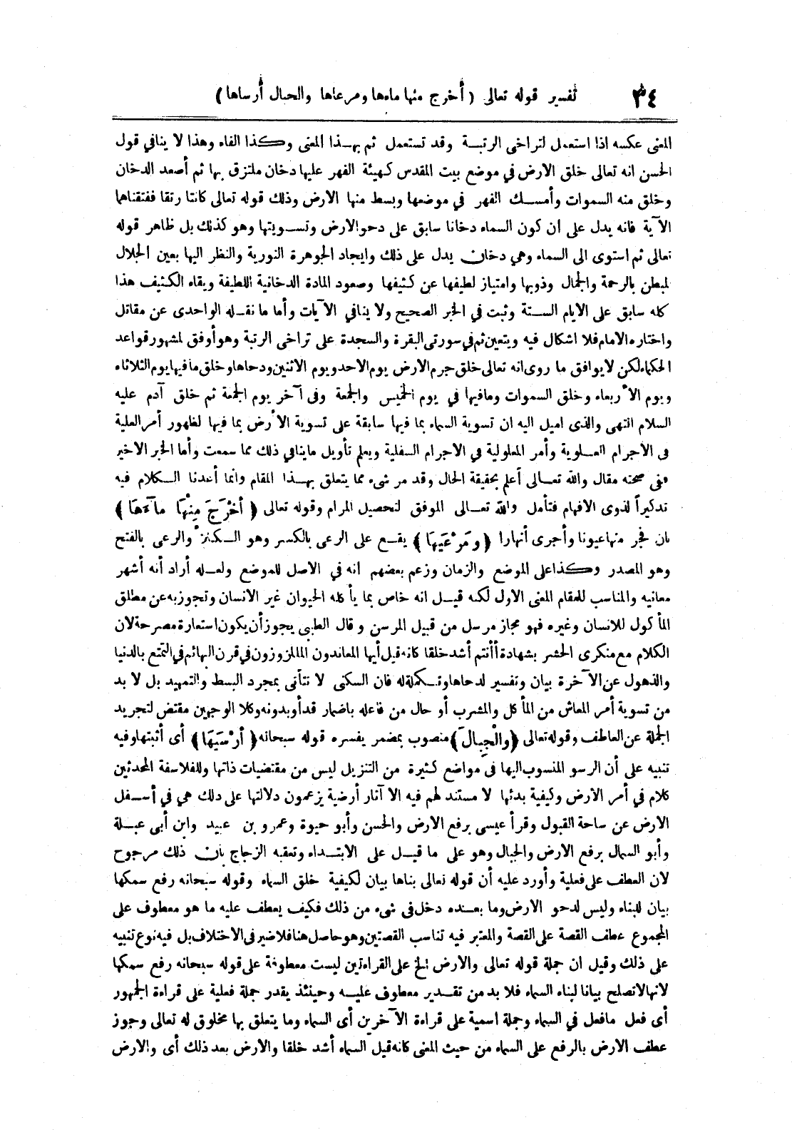 المعنى عكسه إذا استعمل لتراخي الرتبة وقد تستعمل ثم بهذا المعنى وكذا الفاء وهذا لا ينافي قول الحسن أنه تعالى خلق الأرض في موضع بيت المقدس كهيئة الفهر عليها دخان ملتزق بها ثم أصعد الدخان وخلق منه السماوات وأمسك الفهر في موضعها وبسط منها الأرض وذلك قوله تعالى كانتا رتقا ففتقناهما الآية فإنه يدل على أن كون السماء دخانا سابق على دحو الأرض وتسويتها وهو كذلك بل ظاهر قوله تعالى ثم استوى إلى السماء وهي دخان يدل على ذلك وإيجاد الجوهرة النورية والنظر إليها بعين الجلال المبطن بالرحمة والجمال وذوبها وامتياز لطيفها عن كثيفها وصعود المادة الدخانية اللطيفة ويقاء الكثيف هذا كله سابق على الأيام الستة وثبت في الخبر الصحيح ولا ينافي الآيات وأما ما نقله الواحدي عن مقاتل واختاره الإمام فلا إشكال فيه ويتعين ثم في سورتي البقرة والسجدة على تراخي الرتبة وهو أوفق لمشهور قواعد الحكماء لكن لا يوافق ما روي أنه تعالى خلق جرم الأرض يوم الأحد ويوم الأثنين ودحاها وخلق ما فيها يوم الثلاثاء ويوم الأربعاء وخلق السماوات وما فيها في يوم الخميس والجمعة وفي آخر يوم الجمعة ثم خلق آدم عليه السلام انتهى والذي أميل إليه أن تسوية السماء بما فيها سابقة على تسوية الأرض بما فيها لظهور أمر العلية في الأجرام العلوية وأمر المعلولية في الأجرام السفلية ويعلم تأويل ما ينافي ذلك مما سمعت وأما الخبر الأخير ففي صحته مقال والله تعالى أعلم بحقيقة الحال وقد مر شيء مما يتعلق بهذا المقام وإنما أعدنا الكلام فيه تذكيرا لذوي الأفهام فتأمل والله تعالى الموفق لتحصيل المرام وقوله تعالى أخرج منها مآءها بأن فجر منها عيونا وأجرى أنهارا ومرعاها يقع على الرعي بالكسر وهو الكلأ والرعي بالفتح وهو المصدر وكذا على الموضع والزمان وزعم بعضهم أنه في الأصل للموضع ولعله أراد أنه أشهر معانيه والمناسب للمقام المعنى الأول لكنه قيل أنه خاص بما يأكله الحيوان غير الإنسان وتجوز به عن مطلق المأكول للأنسان وغيره فهو مجاز مرسل من قبيل المرسن وقال الطيبي يجوز أن يكون استعارة مصرحة لأن الكلام مع منكري الحشر بشهادة أأنتم أشد خلقا كأنه قيل أيها المعاندون الملزوزون في قرن البهائم في التمتع بالدنيا والذهول عن الآخرة بيان وتفسير لدحاها وتكملة له فإن السكنى لا تتأتى بمجرد البسط والتمهيد بل لا بد من تسوية أمر المعاش من المأكل والمشرب أو حال من فاعله بإضمار قد أو بدونه وكلا الوجهين مقتض لتجريد الجملة عن العاطف وقوله تعالى والجبال منصوب بمضمر يفسره قوله سبحانه أرساها أي أثبتها وفيه تنبيه على الرسو المنسوب إليها في مواضع كثيرة من التنزيل ليس من مقتضيات ذاتها وللفلاسفة المحدثين كلام في أمر الأرض وكيفية بدئها لا مستند لهم فيه إلا آثار أرضية يزعمون دلالتها على ذلك هي في أسفل الأرض عن ساحة القبول وقرأ عيسى برفع الأرض والحسن وأبو حيوة وعمرو بن عبيد وابن أبي عبلة وأبو السمال برفع الأرض والجبال وهو على ما قيل على البتداء وتعقبه الزجاج بأن ذلك مرجوح لأن العطف على فعلية وأورد عليه أن قوله تعالى بناها بيان لكيفية خلق السماء وقوله سبحانه رفع سمكها بيان للبناء وليس لدحو الأرض وما بعده دخل في شيء من ذلك فكيف يعطف عليه ما هو معطوف على المجموع عطف القصة على القصة والمعتبر فيه تناسب القصتين وهو حاصل هنا فلا ضير في الأختلاف بل فيه نوع تنبيه على ذلك وقيل أن جملة قوله تعالى والأرض الخ على القراءتين ليست معطوفة على قوله سبحانه رفع سمكها لأنها لا تصلح بيانا لبناء السماء فلا بد من تقدير معطوف عليه وحينئذ يقدر جملة فعلية على قراءة الجمهور أي فعل ما فعل في السماء وجملة إسمية على قراءة الآخرين أي السماء وما يتعلق بها مخلوق له تعالى وجوز عطف الأرض بالرفع على السماء من حيث المعنى كأنه قيل السماء أشد خلقا والأرض بعد ذلك أي والأرض