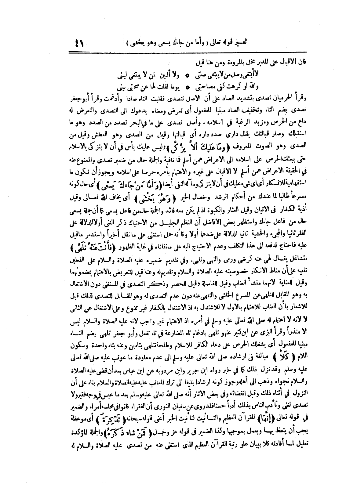يوما لقلت لها عن صحبتي بيني وقرأ الحرميان تصدى بتشديد الصاد على أن الأصل تتصدى فقلبت التاء صادا وأدغمت وقرأ أبو جعفر تصدى بضم التاء وتخفيف الصاد مبنيا للمفعول أي تعرض ومعناه يدعوك إلى التصدي والتعرض له داع من الحرص ومزيد الرغبة في إسلامه وأصل تصدى على ما في البحر تصدد من الصدد وهو ما استقبلك وصار قبالتك يقال داري صدد داره أي قبالتها وقيل من الصدي وهو العطش وقيل من الصدى وهو الصوت المعروف وما عليك ألا يزكى وليس عليك بأس في أن لا يزكى بالأسلام حتى يبعثك الحرص على إسلامه إلى الإعراض عمن أسلم فما نافية والجملة حال من ضمير تصدى والممنوع عنه في الحقيقة الأعراض عمن أسلم لا الأقبال على غيره والأهتمام بأمره حرصا على إسلامه ويجوز أن تكون ما استفهامية للإنكار أي أي شيء عليك في أن لا يتزكى ومآله النفي أيضا وأما من جاءك يسعى أي حال كونه مسرعا طالبا لما عندك من أحكام الرشد وخصال الخير وهو يخشى أي يخاف الله تعالى وقيل أذية الكفار في الإتيان وقيل العثار والكبوة إذ لم يكن معه قائد والجملة حال من فاعل يسعى كما أن جملة يسعى حال من فاعل جاءك واستظهر بعض الأفاضل أن النظم الجليل من الأحتباك ذكر الغنى أو لا للدلالة على الفقر ثانيا والمجيء والخشية ثانيا للدلالة على ضدهما أو لا وكأنه حمل استغنى على ما نقل أخيرا واستشعر ما قيل عليه فاحتاج لدفعه إلى هذا التكلف وعدم الأحتياج إليه على ما نقلناه في غاية الظهور فأنت عنه تلهى تتشاغل يقال لهي عنه كرضي ورمى والتهي وتلهى وفي تقديم ضميره عليه الصلاة و السلام على الفعلين تنبيه على أن مناط الإنكار خصوصيته عليه الصلاة و السلام وتقديم له وعنه قيل للتعريض بالأهتمام بمضمونها وقيل للعناية لأنهما منشأ العتاب وقيل للفاصلة وقيل للحصر وذكر التصدي في المستغني دون الأشتغال به وهو المقابل للتلهي عن المسرع الخاشي والتلهي عنه دون عدم التصدي له وهو المقابل للتصدي لذلك قيل للأشعار بأن العتاب للأهتمام بالأول لا للإشتغال به إذ الأشتغال بالكفار غير ممنوع وعلى الأشتغال عن الثاني لا لأنه لا اهتمام له صلى الله تعالى عليه وسلم في أمره إذ الأهتمام غير واجب لأنه عليه الصلاة و السلام ليس إلا منذرا وقرأ البزي عن ابن كثير عنه تلهى بإدغام تاء المضارعة في تاء تفعل وأبو جعفر تلهى بضم التاء مبنيا للمفعول أي يشغلك الحرص على دعاء الكافر للأسلام وطلحة تتلهى بتائين وعنه بتاء واحدة وسكون اللام كلا مبالغة في إرشاده صلى الله تعالى عليه وسلم إلى عدم معاودة ما عوقب عليه صلى الله تعالى عليه وسلم وقد نزل ذلك كما رواه ابن جرير وابن مردويه عن ابن عباس بعد أن قضى عليه الصلاة و السلام نجواه وذهب إلى أهله وجوز كونه إرشادا بليغا إلى ترك المعاتب عليه عليه الصلاة و السلام بناء على أن النزول في أثناء ذلك وقبل انقضائه وفي بعض الآثار أنه صلى الله تعالى عليه وسلم بعد ما عبس في وجه فقير ولا تصدى لغني وتأدب الناس بذلك أدبا حسنا فقد روي عن سفيان الثوري أن الفقراء كانوا في مجلسه أمراء والضمير في قوله تعالى إنها للقرآن العظيم والتأنيث لتأنيث الخبر أعني قوله سبحانه تذكرة أي موعظة يجب أن يتعظ بها ويعمل بموجبها وكذا الضمير في قوله عز و جل فمن شاء ذكره والجملة والمؤكدة تعليل لما أفادته كلا ببيان علو رتبة القرآن العظيم الذي استغنى عنه من تصدى عليه الصلاة و السلام له