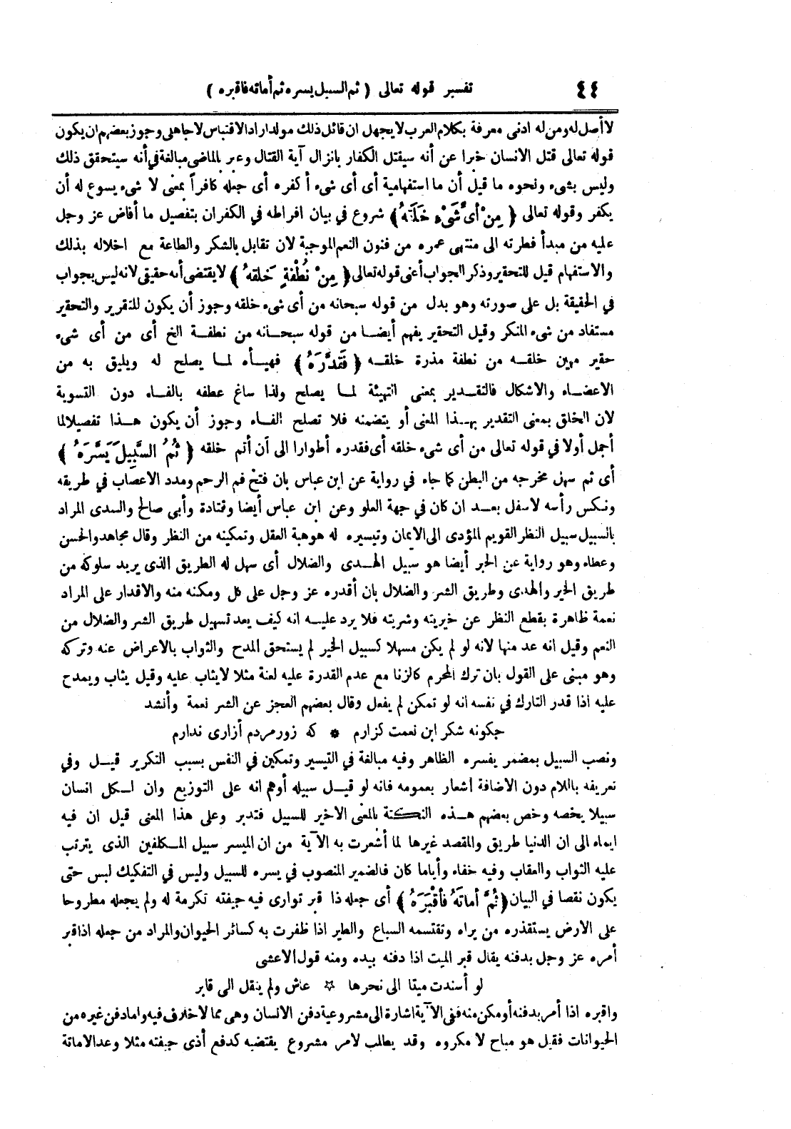 لا أصل له ومن له أدنى معرفة بكلام العرب لا يجهل أن قائل ذلك مولد اراد الأقتباس لا جاهلي وجوز بعضهم أن يكون قوله تعالى قتل الإنسان خبرا عن أنه سيقتل الكفار بإنزال آية القتال وعبر بالماضي مبالغة في أنه سيتحقق ذلك وليس بشيء ونحوه ما قيل أن ما استفهامية أي أي شيء أكفره أي جعله كافرا بمعنى لا شيء يسوع له أن يكفر وقوله تعالى من أي شيء خلقه شروع فيبيان إفراطه في الكفران بتفصيل ما أفاض عز و جل عليه من مبدأ فطرته إلى منتهى عمره من فنون النعم الموجبة لأن تقابل بالشكر والطاعة من إخلاله بذلك والستفهام قيل للتحقير وذكر الجواب أعني قوله تعالى مننطفة خلقه لا يقتضي أنه حقيقي لأنه ليس بجواب في الحقيقة بل على صورته وهو بدل من قوله سبحانه من أي شيء خلقه وجوز أن يكون للتقرير والتحقير مستفاد من شيء المنكر وقيل التحقير يفهم أيضا من قوله سبحانه مننطفة الخ أي من أي شيء حقير مهين خلقه من نطفة مذرة خلقه فقدره فهيأه لما يصلح له ويليق به من الأعضاء والأشكال فالتقدير بمعنى التهيئة لما يصلح ولذا ساغ عطفه بالفاء دون التسوية لأن الخلق بمعنى التقدير بهذا المعنى أو يتضمنه فلا تصلح الفاء وجوز أن يكون هذا تفصيلا لما أجمل أولا في قوله تعالى من أي شيء خلقه أي فقدره أطوار إلى أن أتم خلقه ثم السبيل يسره أي ثم سهل مخرجه من البطن كما في رواية عن ابن عباس بأن فتح فم الرحم ومدد الأعصاب في طريقه ونكس رأسه لأسفل بعد أن كان في جهة العلو وعن ابن عباس أيضا وقتادة وأبي صالح والسدي المراد بالسبيل سبيل النظر القويم المؤدي إلى الإيمان وتيسيره له هو هبة العقل وتمكينه من النظر وقال مجاهد والحسن وعطاء وهو رواية عن الحبر أيضا هو سبيل الهدى والضلال أي سهل له الطريق الذي يريد سلوكه من طريق الخير والهدى وطريق الشر والضلال بأن أقدره عز و جل على كل ومكنه منه والأقدار على المراد نعمة ظاهرة بقطع النظر عن خيريته وشريته فلا يرد عليه أنه كيف يعد تسهيل طريق الشر والضلال من النعم وقيل أنه عد منها لأنه لو لم يكن مسهلا كسبيل الخير لم يستحق المدح والثواب بالأعراض عنه وتركه وهو مبني على القول بأن ترك المحرم كالزنا مع عدم القدرة عليه لغة مثلا لا يثاب عليه وقيل يثاب ويمدح عليه إذا قدر التارك في نفسه أنه لو تمكن لم يفعل وقال بعضهم العجز عن الشر نعمة وأنشد جكونه شكر ابن نعمت كزارم