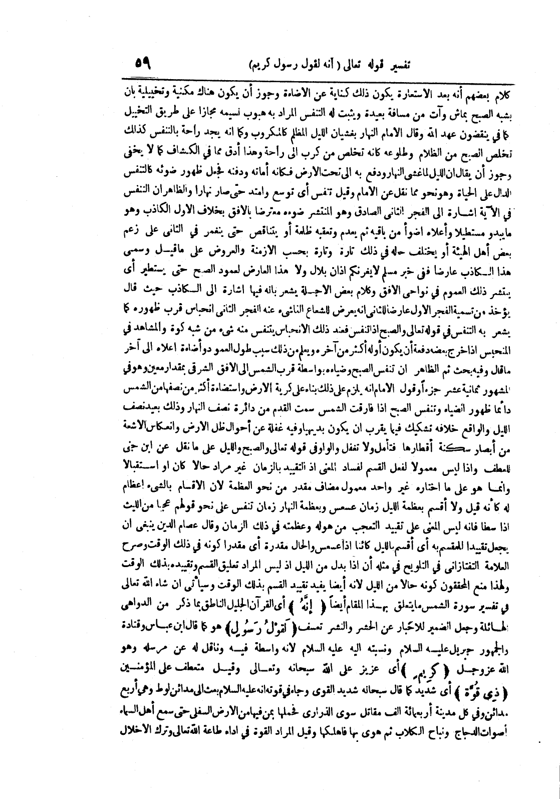 كلام بعضهم أنه بعد الإستعارة يكون ذلك كناية عن الإضاءة وجوز أن يكون هناك مكنية وتخييلية بأن يشبه الصبح بماش وآت من مسافة بعيدة ويثبت له التنفس المراد به هبوب نسيمه مجازا على طريق التخييل كما في ينقضون عهد الله وقال الإمام النهار بغشيان الليل المظلم كالمكروب وكما أنه يجد راحة بالتنفس كذلك تخلص من الظلام وطلوعه كأنه تخلص من كرب إلى راحة وهذا أدق مما بني الكشاف كما لا يخفى وجوز أن يقال أن الليل لما غشى النهار ودفع به إلى تحت الأرض فكأنه أماته ودفنه فجعل ظهور ضوئه كالتنفس الدال على الحياة وهو نحو مما نقل عن الإمام وقيل تنفس أي توسع وامتد حتى صار نهارا والظاهر أن التنفس في الآية إشارة إلى الفجر الثاني الصادق وهو المنتشر ضوءه معترضا بالأفق بخلاف الأول الكاذب وهو ما يبدو مستطيلا وأعلاه أضوأ من باقيه ثم يعدم وتعقبه ظلمة أو يتناقص حتى ينغمر في الثاني على زعم بعض أهل الهيئة أو يختلف حاله في ذلك تارة وتارة بحسب الأزمنة والعروض على ما قيل وسمى هذا الكاذب عارضا ففي خبر مسلم لا يغرنكم أذان بلال ولا هذا العارض لعمود الصبح حتى يستطير أي ينتشر ذلك العموم في نواحي الأفق وكلام بعض الأجلة يشعر بأنه فيها إشارة إلى الكاذب حيث قال يؤخذ من تسمية الفجر الأول عارضا للثاني أنه يعرض للشعاع الناشيء عنه الفجر الثاني انحباس قرب ظهوره كما يشعر به التنفس في قوله تعالى والصبح إذا تنفس فعند ذلك الأنحباس يتنفس منه شيء من شبه كوة والمشاهد في المنحبس إذا خرج بعضه دفعة أن يكون أوله أكثر من آخره ويعلم من ذلك سبب طول العمود وإضاءة أعلاه إلى آخر ماقال وفيه بحث ثم الظاهر أن تنفس الصبح وضياءه بواسطة قرب الشمس إلى الأفق الشرقي بمقدار معين وهو في المشهور ثمانية عشر جزءا وقول الإمام أنه يلزم على ذلك بناء على كروية الأرض واستضاءة أكثر من نصفها من الشمس دائما ظهور الضياء وتنفس الصبح إذا فارقت الشمس سمت القدم من دائرة نصف النهار وذلك بعيد نصف الليل والواقع خلافه تشكيك فيما يقرب أن يكون بديهيا وفيه غفلة عن أحوال ظل الأرض وانعكاس الأشعة من أبصار سكنة أقطارها فتأمل ولا تغفل والواو في قوله تعالى والصبح والليل على ما نقل عن ابن جني للعطف وإذا ليس معمولا لفعل القسم لفساد المعنى إذ التقييد بالزمان غير مراد حالا كان أو استقبالا وإنما هو على ما اختاره غير واحد معمول مضاف مقدر من نحو العظمة لأن الأقسام بالشيء إعظام له كأنه قيل ولا أقسم بعظمة الليل زمان عسعس وبعظمة النهار زمان تنفس على نحو قولهم عجبا منالليث إذا سطا فإنه ليس المعنى على تقييد التعجب من هوله وعظمته في ذلك الزمان وقال عصام الدين ينبغي أن يجعل تقييدا للمقسم به أي أقيم بالليل كائنا إذا عسعس والحال مقدرة أي مقدرا كونه في ذلك الوقت وصرح العلامة التفتازاني في التلويح في مثله أن إذا بدل من الليل إذ ليس المراد تعليق القسم وتقييده بذلك الوقت ولهذا منع المحققون كونه حالا من الليل لأنه أيضا يفيد تقييد القسم بذلك الوقت وسيأتي إن شاء الله تعالى في تفسير سورة الشمس ما يتعلق بهذا المقام أيضا إنه أي القرآن الجليل الناطق بما ذكر من الدواهي الهائلة وجعل الضمير للأخبار عن الحشر والنشر تعسف لقول رسول هو كما قال ابن عباس وقتادة والجمهور جبريل عليه السلام ونسبته إليه عليه السلام لأنه واسطة فيه وناقل له عن مرسله وهو الله عز و جل كريم أي عزيز على الله سبحانه وتعالى وقيل متعطف على المؤمنين ذي قوة أي شديد كما قال سبحانه شديد القوى وجاء في قوته أنه عليه السلام بعث إلى مدائن لوط وهي أربع مدائن وفي كل مدينة أربعمائة ألف مقاتل سوى الذراري فحملها بمن فيها من الأرض السفلي حتى سمع أهل السماء أصوات الدجاج ونباح الكلاب ثم هوى بها فأهلكها وقيل المراد القوة في أداء طاعة الله تعالى وترك الإخلال