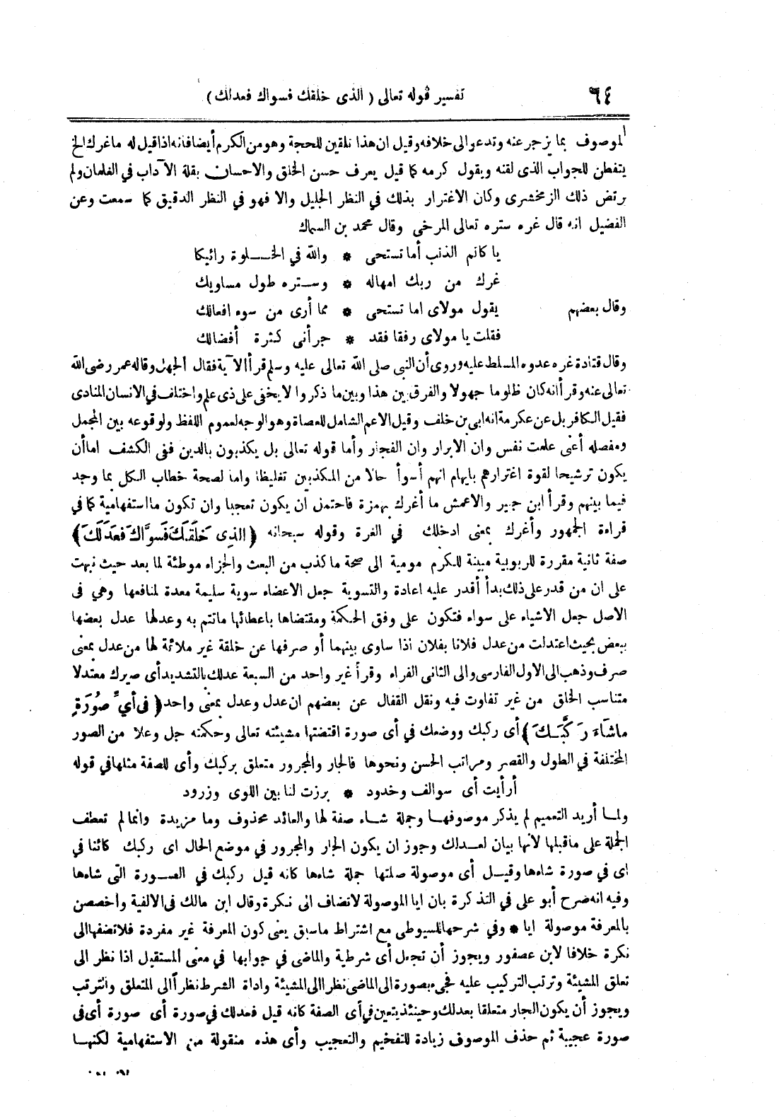 وفي شرحها للسيوطي مع اشتراط ما سبق يعني كون المعرفة غير مفردة فلا تضفها إلى نكرة خلافأئ لابن عصفور ويجوز أن تجعل أي شرطية والماضي في جوابها في معنى المستقبل إذا نظر إلى تعلق المشيئة وترتب التركيب عليه فجيء بصورة إلى الماضي نظر إلى المشيئة وأداة الشرط نظرا إلى المتعلق والترتب ويجوز أن يكون الجار متعلقا بعدلك وحينئذ يتعين في أي الصفة كأنه قيل فعدلك في صورة أي في صورة عجيبة ثم حذف الموصوف زيادة للتفخيم والتعجيب وأي هذه منقولة من الأستفهام لكنها