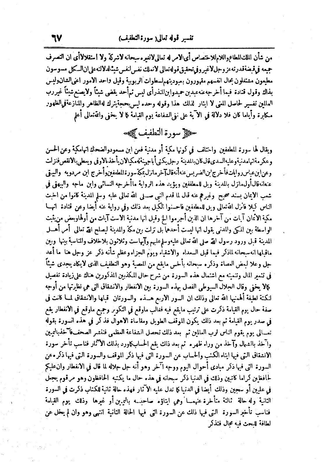 ويقال لها سورة المطففين واختلف في كونها مكية أو مدنية فعن ابن مسعود والضحاك أنها مكية وعن الحسن وعكرمة أنها مدنية وعليه السدي قال بالمدينة رجل يكنى أبا جهينة له مكيالان يأخذ بالأوفى ويعطي بالأنقص فنزلت وعن ابن عباس روايات فأخرج ابن الضريس عنه أنه قال آخر ما نزل بمكة سورة المطففين وأخرج ابن مردويه والبيهقي عنه أنه قال أول ما نزل بالمدينة ويل للمطففين ويؤيد هذه الرواية ما أخرجه النسائي وابن ماجه والبيهقي في شعب الإيمان بسند صحيح وغيرهم عنه قال لما قدم النبي صلى الله تعالى عليه وسلم المدينة كانوا من أخبث الناس كيلا فأنزل الله تعالى ويل للمطففين فأحسنوا الكيل بعد ذلك وفي رواية عنه أيضا وعن قتادة أنها مكية الأثمان آيات من آخرها إن الذين أجرموا الخ وقيل إنها مدنية إلا ست آيات من أولها وبعض من يثبت الواسطة بين المكي والمدني يقول إنها ليست أحدهما بل نزلت بين مكة والمدينة ليصلح الله تعالى أمر أهل المدينة قبل ورود رسول الله صلى الله تعالى عليه وسلم عليهم وآيها ست وثلاثون بلا خلاف والمناسبة بينها وبين ما قبلها أنه سبحانه لما ذكر فيما قبل السعداء والأشقياء ويوم الجزاء وعظم شأنه ذكر عز و جل هنا ما أعد جل وعلا لبعض العصاة وذكره سبحانه بأخس ما يقع من المعصية وهو التطفيف الذي لا يكاد يجدي شيئا في تثمير المال وتنميته مع اشتمال هذه السورة من شرح حال المكذبين المذكورين هناك على زيادة تفصيل كما لا يخفى وقال الجلال السيوطي الفصل بهذه السورة بين الأنفطار والأنشقاق التي هي نظيرتها من أوجه لنكتة لطيفة ألهمنيها الله تعالى وذلك أن السور الأربع هذه والسورتان قبلها والأنشقاق لما كانت في صفة حال يوم القيامة ذكرت على ترتيب ما يقع فيه فغالب ما وقع في التكوير وجميع ما وقع في الأنفطار يقع في صدر يوم القيامة ثم بعد ذلك يكون الموقف الطويل ومقاساة الأهوال فذكره في هذه السورة بقوله تعالى يوم يقوم الناس لرب العالمين ثم بعد ذلك تحصل الشفاعة العظمى فتنشر الصحف فآخذ باليمين وآخذ بالشمال وآخذ من وراء ظهوره ثم بعد ذلك يقع الحساب كما ورد بذلك الآثار فناسب تأخر سورة الأنشقاق التي فيها إيتاء الكتب والحساب على السورة التي فيها ذكر الموقف والسورة التي فيها ذكره عن السورة التي فيها ذكر مبادي أحوال اليوم ووجه آخر وهو أنه جل جلاله لما قال في الأنفطار وإن عليكم لحافظين كراما كاتبين وذلك في الدنيا ذكر سبحانه في هذه حال ما يكتبه الحافظون وهو مرقوم يجعل في عليين أو سجين وذلك أيضا في الدنيا كما تدل عليه الآثار فهذه حالة ثانية للكتاب ذكرت في السورة الثانية وله حالة ثالثة متأخرة عنهما وهي إيتاؤه صاحبه باليمين أو غيرها وذلك يوم القيامة فناسب تأخير السورة التي فيها ذلك عن السورة التي فيها الحالة الثانية انتهى وهو وإن لم يخل عن لطافة للبحث فيه مجال فتذكر