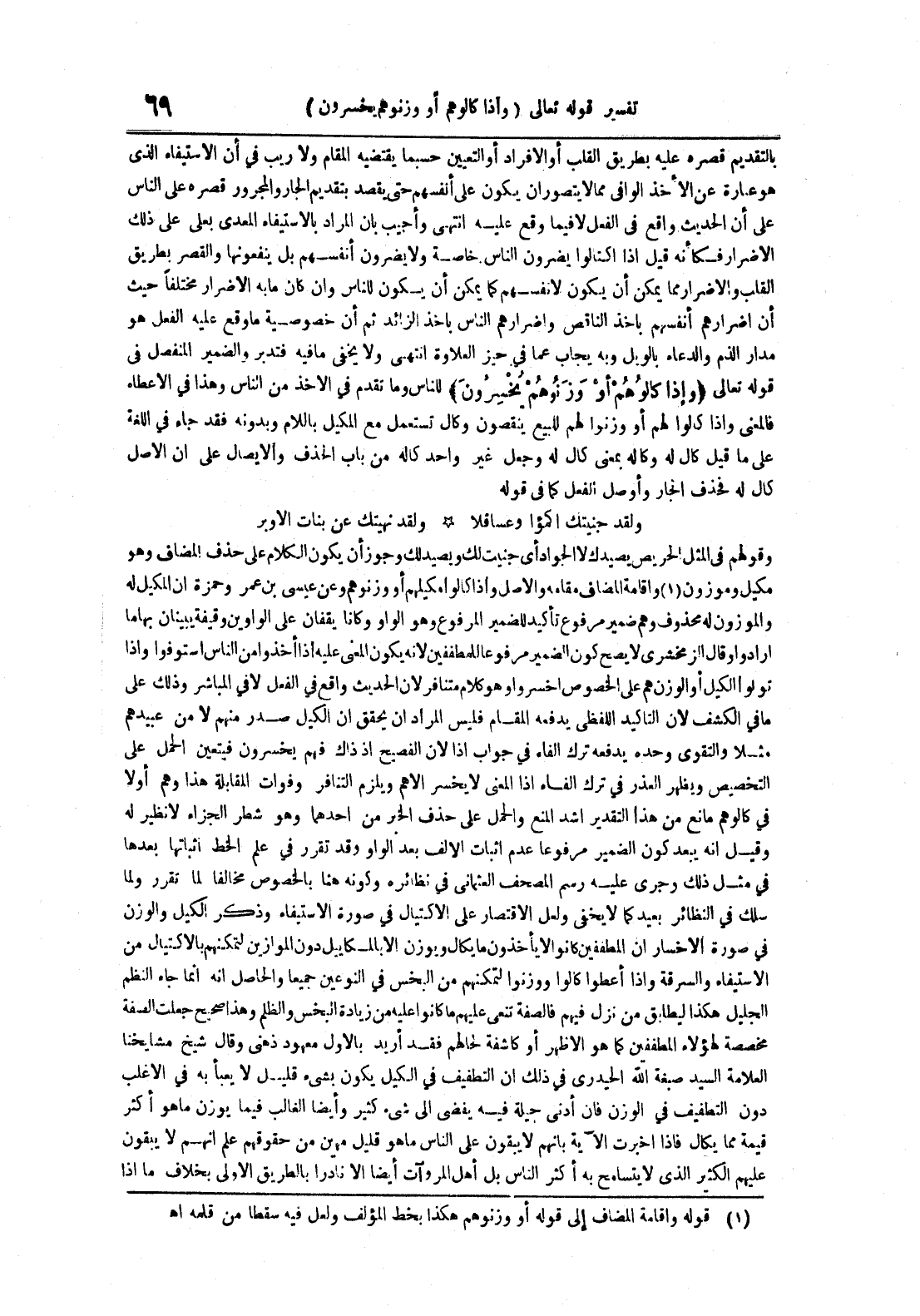 ولقد نهيتك عن بنات الأوبر وقولهم في المثل الحريص يصيدك لا الجواد أي جنيت لك ويصيد لك وجوز أن يكون الكلام على حذف المضاف وهو مكيل وموزون وإقامة المضاف مقامه والأصل وإذا كالوا مكيلهم أو وزنوهم وعن عيسى بن عمر وحمزة أن المكيل له والموزون له محذوف وهم ضمير مرفوع تأكيد للضمير المرفوع وهو الواو وكانا يقفان على الواوين وقيفة يبينان بهاما أرادوا وقال الزمخشري لا يصح كون الضمير مرفوعا للمطففين لأنه يكون المعنى عليه إذا أخذوا من الناس استوفوا وإذا تولوا الكيل أو الوزن هم على الخصوص أخسروا وهو كلام متنافر لأن الحديث واقع في الفعل لا في المباشر وذلك على ما في الكشف لأن التأكيد اللفظي يدفعه المقام فليس المراد أن يحقق أن الكيل صدر منهم لا من عبيدهم مثلا والتقوى وحده يدفعه ترك الفاء في جواب إذا لأن الفصيح إذ ذاك فهم يخسرون فيتعين الحمل على التخصيص ويظهر العذر في ترك الفاء إذا المعنى لا يخسر الأهم ويلزم التنافر وفوات المقابلة هذا وهم أولا في كالوهم مانع من هذا التقدير أشد المنع والحمل على حذف الخبر من احدهما وهو شطر الجزاء لا نظير له وقيل أنه يبعد كون الضمير مرفوعا عدم إثبات الألف بعد الواو وقد تقرر في علم الخط إثباتها بعدها في مثل ذلك وجرى عليه رسم المصحف العثماني في نظائره وكونه هنا بالخصوص مخالفا لما تقرر ولما سلك في النظائر بعيد كما لا يخفى ولعل الأقتصار على الأكتيال في صورة الأستيفاء وذكر الكيل والوزن في صورة الأخسار إن المطففين كانوا لا يأخذون ما يكال ويوزن إلا بالمكاييل دون الموازين لتمكنهم بالأكتيال من الأستيفاء والسرقة وإذا أعطوا كالوا ووزنوا لتمكنهوامن البخس في النوعين جميعا والحاصل أنه إنما جاء النظم الجليل هكذا ليطابق من نزل فيهم فالصفة تنعى عليهم ما كانوا عليه من زيادة البخس والظلم وهذا صحيح جعلت الصفة مخصصة لهؤلاء المطففين كما هو الأظهر أو كاشفة لحالهم فقد أريد بالأول معهود ذهني وقال شيخ مشايخنا العلامة السيد صبغة الله الحيدوي في ذلك أنالتطفيف في الكيل يكون بشيء قليل لا يعبأ به في الأغلب دون التطفيف في الوزن فإن أدنى حيلة فيه يفضي إلى شيء كثير وأيضا الغالب فيما يوزن ماهو أكثر قيمة مما يكال فإذا أخبرت الآية بأنهم لا يبقون على الناس ما هو قليل مهين من حقوقهم على أنهم لا يبقون عليهم الكثير الذي لا يتسامح به أكثر الناس بل أهل المروآت أيضا إلا نادرا بالطريق الأولى بخلاف ما إذا