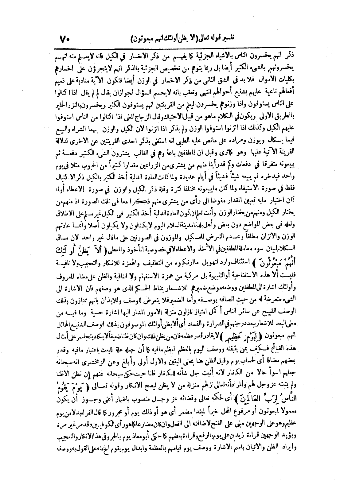ذكر أنهم يخسرون الناس بالأشقياء الجزئية كما يفهم من ذكر الإخسار في الكيل فإنه لا يعلم منه أنهم يخسرونهم بالشيء الكثير أيضا بل يتوهم من تخصيص الجزئية بالذكر أنهم لا يتجرؤن على إخسارهم بكليات الأموال فلا بد في الشق الثاني من ذكر الإخسار في الوزن أيضا فتكون الآية منادية على ذميم أفعالهم ناعية عليهم بشنيع أحوالهم انتهى وتعقب بأنه لا يحسم السؤال لجوازان يقال لم لم يقل إذا اكتالوا على الناس يستوفون وإذا وزنوهم يخسرون ليعلم من القرينتين أنهميستوفون الكثير ويخسرون بالنزر الحقير بالطريق الأولى ويكون في الكلام ما هو من قبيل الأحتباك وقال الزجاج المعنى إذا اكتالوا من الناس استوفوا عليهم الكيل وكذلك إذا اتزنوا استوفوا الوزن ولم يذكر إذا اتزنوا لأن الكيل والوزن بهما الشراء والبيع فيما يكال ويوزن ومراده علىما نص عليه الطيبي أنه استغنى بذكر إحدى القريتين عن الأخرى لدلالة القرينة الآتية عليها وهو كما ترى وقيل إن المطففين باعة وهم في الغلالب يشترون الشيء الكثير دفعة ثم يبيعونه متفرقا في دفعات وكم قد رأينا منهم من يشتري من الزارعين مقدارا كثيرا من الحبوب مثلا في يوم واحد فيدخره ثم يبيعه شيئا فشيئا في أيام عديدة ولما كانت العادة الغالبة أخذ الكثير بالكيل وذكر الأكتيال فقط في صورة الأستيفاء ولما كان ما يبيعونه مختلفا كثرة وقلة وذكر الكيل والوزن في صورة الإعطاء أو اختيار ما به تعيين المقدار مفوضا إلى رأي من يشتري منهم ذكرا معا في تلكالصورة إذ منهم من يختار الكيل ومنهم من يختار الوزن وأنت تعلم أن كون العادة الغالبة أخذ الكثير في الكيل غير مسلم على الإطلاق ولعله في بعض المواضع دون بعض وأهل بلدنا مدينة السلام اليوم لا يكتالون ولا يكيلون أصلا وإنما عادتهم الوزن والأتزان مطلقا وعدم التعرض للمكيل والموزون في الصورتين على ما قال غير واحد لأن مساق الكلام لبيان سوء معاملة المطففين في الأخذ والإعطاء لا في خصوصية المأخوذ والمعطي ألا يظن أولئك أنهم مبعوثون استئناف وارد لتهويل ماما ارتكبوه من التطفيف والهمزة لإنكار والتعجيب ولا نافية فليست ألا هذه الأستفتاحية أو التنبيهية بل مركبة من همزة الأستفهام ولا النافية والظن على معناه المعروف وأولئك إشارة إلى المطففين ووضعه موضع ضميرهم للأشعار بمناط الحكم الذي هو وصفهم فإن الإشارة إلى الشيء متعرضة له من حيث اتصافه بوصفه وأما الضمير فلا يتعرض للوصف وللإيذان بأنهم ممتازون بذلك الوصف القبيح عن سائر الناس أكمل امتياز نازلون منزلة الأمور المشار إليها إشارة حسية وما فيه منمعنى البعد للإشعار ببعد درجتهم في الشرارة والفساد أي لا يظن أولئك الموصوفون بذلك الوصف الشنيع الهائل أنهم مبعوثون ليوم عظيم لا يقادر قدر عظمه فإن من يظن ذلك وإن كان ظنا ضعيفا لا يكاد يتجاسر على أمثال هذه القبائح فكيف بمن يتيقنه ووصف اليوم بالعظم لعظم ما فيه كما أن جعله علة للبعث باعتبار ما فيه وقدر بعضهم مضافا أي لحساب يوم وقيل الظن هنا بمعنى اليقين والأول أولى وأتلغ وعن الزمخشري أنه سبحانه جعلهم أسوأ حالا من الكفار لأنه أثبت جل شأنه للكفار ظنا حيت حكى سبحانه عنهم إن نظن إلا ظنا ولم يثبته عز و جل لهم والمراد أنه تعالى نزلهم منزلة من لا يظن ليصح الإنكار وقوله تعالى يوم يقوم الناس لرب العالمين أي لحكمه تعالى وقضائه عز و جل منصوب بإضمار أعني وجوز أن يكون معمولا لمبعوثون أو مرفوع خبرا لمبتدأ مضمر أي هو أو ذلك يوم مجرور كما قال الفراء بدلا منيوم عظيم وهو على الوجهين مبني على الفتح لأضافته إلى الفعل وإن كان مضارعا كما هو رأي الكوفيين وقد مر غير مرة ويؤيد الوجهين قراءة زيد بن علي يوم بالرفع قراءة بعضهم كما حكى أبو معاذ يوم بالجر وفي هذا الإنكار والتعجب وإيراد الظن والإتيان باسم الإشارة ووصف يوم قيامهم بالعظمة وإبدال يوم يقوم الخ منه على القول به ووصفه