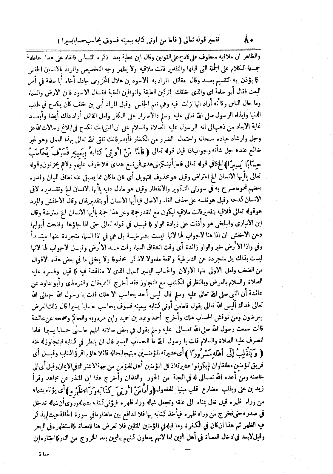 والظاهر أن ملاقيه معطوف على كادح على القولين وقال ابن عطية بعد ذكره الثاني فألفاه على هذا عاطفة جملة الكلام على الجملة التي قبلها والتقدير فأنت ملاقيه ولا يظهر وجه التخصيص والمراد بالإنسان الجنس كما يؤذن به التقسيم بعد وقال مقاتل المراد به الأسود بن هلال المخزومي جادل أخاه أبا سلمة في أمر البعث فقال أبو سلمة أي والذي خلقك لتركبن الطبقة ولتوافين العقبة فقال الأسود فأين الأرض والسماء وما حال الناس وكأنه أراد أنها نزلت فيه وهي تعم الجنس ويل المراد أبي بن خلف كان يكدح في طلب الدنيا وإيذاء الرسول صلى الله تعالى عليه وسلم والإصرار على الكفر ولعل القائل أراد ذلك أيضا وأبعد غاية الإبعاد من ذهب إلى أنه الرسول عليه الصلاة و السلام على أن المعنى إنك تكدح في إبلاغ رسالات الله عز و جل وإرشاد عباده سبحانه واحتمال الضرر من الكفار فأبشر إنك تلقى الله تعالى بهذا العمل وهو غير ضائع عنده جل شأنه وجواب إذا قيل قوله تعالى فأما من أوتي كتابه بيمينه فسوف يحاسب حسابا يسيرا الخ كما في قوله تعالى فأما يأتيكم مني هدى فمن تبع هداي فلا خوف عليهم ولا هم يحزنون وقوله تعالى يا أيها الإنسان الخ اعتراض وقيل هو محذوف للتهويل أي كان ما كان مما يضيق عنه نطاق البيان وقدره بعضهم نحو ما صرح به في سورتي التكوير والإنفطار وقيل هو ما دل عليه يا أيها الإنسان الخ وتقديره لاقى الإنسان كدحه وقيل هو نفسه على حذف الفاء والأصل فيا أيها الإنسان أو بتقدير يقال وقال الأخفش والمبرد وهو قوله تعالى فملاقيه بتقدير فأنت ملاقيه ليكون مع المقدر جملة وعلى هذا جملة يا أيها الإنسان الخ معترضة وقال ابن الأنباري والبلخي هو وأذنت على زيادة الواو كما قيل في قوله تعالى حتى إذا جاؤها وفتحت أبوابها وعن الأخفش أن إذا هنا لا جواب لها لأنها ليست بشرطية بل هي في إذا السماء متجردة عنها مبتدأ وفي وإذا الأرض خبر والواو زائدة أي وقت انشقاق السماء وقت مد الأرض وقبل لا جواب لها لأنها ليست بذلك بل متجردة عن الشرطية واقعة مفعولا لا ذكر محذوفا ولا يخفى ما في هذه الأقوال من الضعف ولعل الأولى منها الأولان والحساب اليسير السهل الذي لا مناقشة فيه كما قيل وفسره عليه الصلاة و السلام بالعرض وبالنظر في الكتاب مع التجاوز فقد أخرج الشيخان والترمذي وأبو داود عن عائشة أن النبي صلى الله تعالى عليه وسلم قال ليس أحد يحاسب إلا هلك قلت يا رسول الله جعلني الله تعالى فداك أليس الله تعالى يقول فأما من أوتي كتابه بيمينه فسوف يحاسب حسابا يسيرا قال ذلك العرض يعرضون ومن نوقش الحساب هلك وأخرج أحمد وعبد بن حميد وابن مردويه والحاكم وصححه عن عائشة قالت سمعت رسول الله صلى الله تعالى عليه وسلم يقول في بعض صلاته اللهم حاسبني حسابا يسيرا فلما انصرف عليه الصلاة و السلام قلت يا رسول الله ما الحساب اليسير قال أن ينظر في كتابه فيتجاوز له عنه وينقلب إلى أهله مسرورا أي عشيرته المؤمنين مبتهجا بحاله قائلا هاؤم اقرؤا كتابيه وقيل أي فريق مطلقا وإن لم يكونوا عشيرته إذ كل المؤمنين أهل للمؤمن من جهة الأشتراك في الإيمان وقيل أي إلى خاصته ومن أعده الله تعالى له في الجنة من الحور والغلمان وأخرج هذا ابن المنذر عن مجاهد وقرأ زيد بن علي ويقلب مضارع قلب مبنيا للمفعول وأما من أوتي كتابه وراء ظهره أي يؤتاه بشماله من وراء ظهره قيل تغل يمناه إلى عنقه وتجعل شماله وراء ظهره فيؤتى كتابه بشماله وروي أن شماله تدخل في صدره حتى تخرج من وراء ظهره فيأخذ كتابه بها فلا تدافع بين ما هنا وما في السورة الحاقة حيث لم يذكر فيه الظهر ثم هذا إن كان في الكفرة وما قبله في المؤمنين المتقين فلا تعرض هنا للعصاة كما استظهره في البحر وقيل لا بعد في إدخال العصاة في أهل اليمين أما لأنهم يعطون كتبهم باليمين بعد الخروج من النار كما اختاره ابن