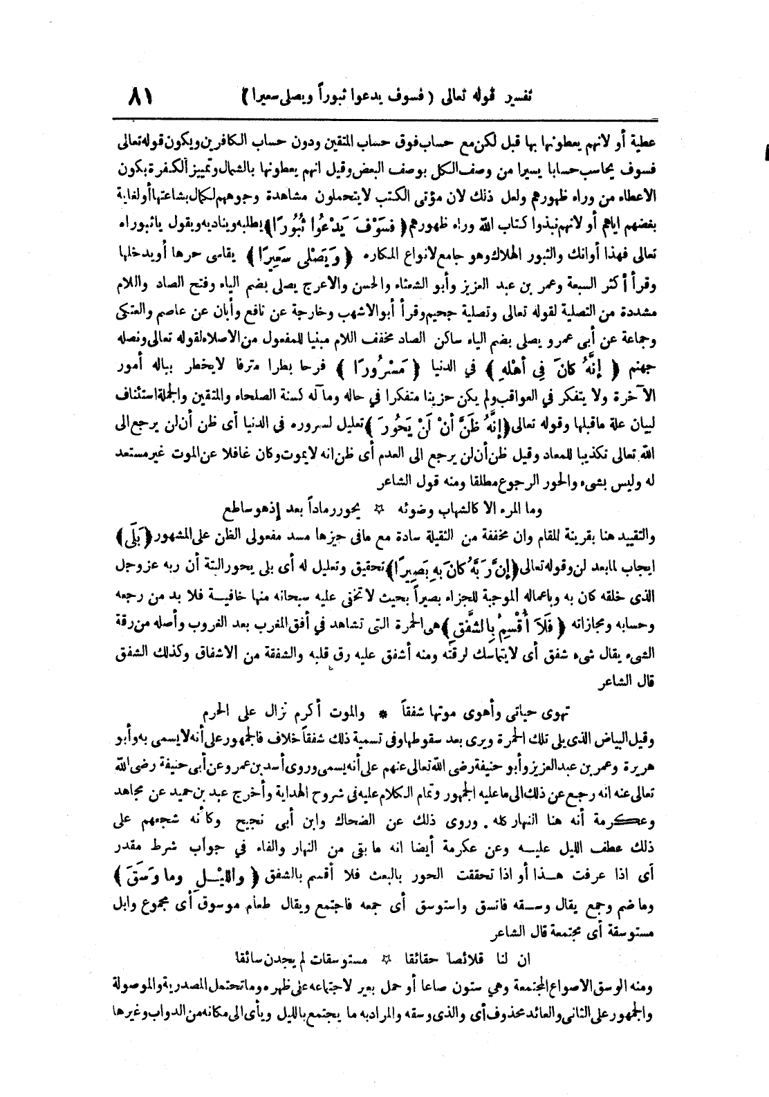 عطية أو لأنهم يعطونها بها قبل لكن مع حساب فوق حساب المتقين ودون حساب الكافرين ويكون قوله تعالى فسوف يحاسب حسابا يسيرا من وصف الكل بوصف البعض وقيل أنهم يعطونها بالشمال وتمييز الكفرة بكون الإعطاء من وراء ظهورهم ولعل ذلك لأن مؤتي الكتب لا يتحملون مشاهدة وجوههم لكمال بشاعتها أو لغاية بغضهم إياهم أو لأنهم نبذوا كتاب الله وراء ظهورهم فسوف يدعوا ثبورا يطلبه ويناديه ويقول يا ثبوراه تعالى فهذا أوانك والثبور الهلاك وهو جامع لأنواع المكاره ويصلي سعيرا يقاسى حرها أو يدخلها وقرأ أكثر السبعة وعمر بن عبد العزيز وأبو الشعثاء والحسن والأعرج يصلي بضم الياء وفتح الصاد واللام مشددة من التصلية لقوله تعالى وتصلية جحيم وقرأ أبو الأشهب وخارجة عن نافع وأبان عن عاصم والعتكي وجماعة عن أبي عمرو يصلي بضم الياء ساكن الصاد مخفف اللام مبنيا للمفعول من الأصلاء لقوله تعالى ونصله جهنم إنه كان في أهله في الدنيا مسرورا فرحا بطرا مترفا لا يخطر بباله أمور الآخرة ولا يتفكر في العواقب ولم يكن حزبنا متفكرا في حاله ومآله كسنة الصلحاء والمتقين والجملة استئناف لبيان علة ما قبلها وقوله تعالى إنه ظن أن لن يحور تعليل لسروره في الدنيا أي ظن أن لن يرجع إلى الله تعالى تكذيبا للمعاد وقيل ظن أن لن يرجع إلى العدم أي ظن أنه لا يموت وكان غافلا عن الموت غير مستعد له وليس بشيء والحور الرجوع مطلقا ومنه قول الشاعر وما المرء إلا كالشهاب وضوئه