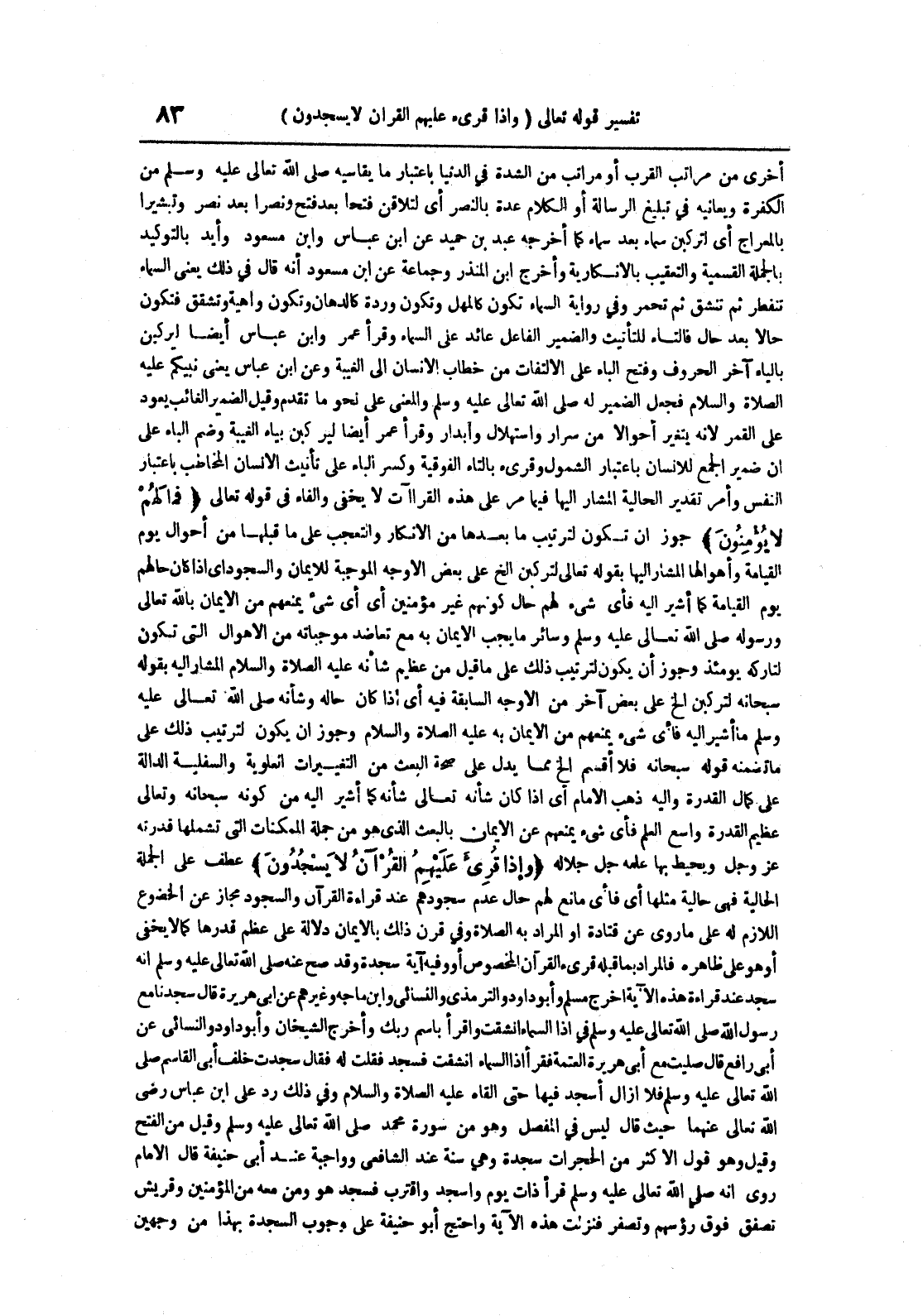 أخرى من مراتب القرب أو مراتب من الشدة في الدنيا باعتبار ما يقاسيه صلى الله تعالى عليه وسلم من الكفرة ويعانيه في تبليغ الرسالة أو الكلام عدة بالنصر أي لتلاقن فتحا بعد فتح ونصرا بعد نصر وتبشيرا بالمعراج أي لتركبن سماء بعد سماء كما أخرجه عبد بن حميد عن ابن عباس وابن مسعود وأيد بالتوكيد بالجملة القسمية والتعقيب بالإنكارية وأخرج ابن المنذر وجماعة عن ابن مسعود أنه قال في ذلك يعني السماء تنفطر ثم تنشق ثم تحمر وفي رواية السماء تكون كالمهل وتكون وردة كالدهان وتكون واهية وتشقق فتكون حالا بعد حال فالتاء للتأنيث والضمير الفاعل عائد على السماء وقرأ عمر وابن عباس أيضا ليركبن بالياء آخر الحروف وفتح الباء على الألتفات من خطاب الإنسان إلى الغيبة وعن ابن عباس يعني نبيكم عليه الصلاة و السلام فجعل الضمير له صلى الله تعالى عليه وسلم والمعنى على نحو ما تقدم وقيل الضمير الغائب يعود على القمر لأنه يتغير أحوالا من سرار واستهلال وإبدار وقرأ عمر أيضا ليركبن بياء الغيبة وضم الباء على أن ضمير الجمع للإنسان باعتبار الشمول وقريء بلا لتاء الفوقية وكسر الباء على تأنيث الإنسان المخاطب باعتبار النفس وأمر التقدير الحالية المشار إليها فيما مر على هذه القرآت لا يخفى والفاء في قوله تعالى فما لهم لا يؤمنون جوز أن تكون لترتيب ما بعدها من الإنكار والتعجب على ما قبلها من أحوال القيامة وأهوالها المشار إليها بقوله تعالى لتركبن الخ على بعض الأوجه الموجبة للإيمان والسجود إذا كان حالهم يوم القيامة كما أشير إليه فأي شيء لهم حال كونهم غير مؤمكنين أي أي شيء يمنعهم من الإيمان بالله تعالى ورسوله صلى الله تعالى عليه وسلم وسائر ما يجب الإيمان مع تعاضد موجباته من الأهوال التي تكون لتاركه يومئذ وجوز أن يكون لترتيب ذلك على ما قيل من عظيم شأنه عليه الصلاة و السلام المشار إليه بقوله سبحانه لتركبنالخ على بعض آخر من الأوجه السابقة فيه أي إذا كان حاله وشأنه صلى الله تعالى عليه وسلم ما أإليه فأي شيء يمنعهم به عليه الصلاة و السلام وجوز أن يكون لترتيب ذلك على ما تضمنه قوله سبحانه فلا أقسم الخ يدل على صحة البعث من التغييرات العلوية والسفلية الدالة على كمال القدرة وإليه ذهب الإمام أي إذا كان شأنه تعالى شأنه كما أشير إليه من كونه سبحانه وتعالى عظيم القدرة واسع العلم فأي شيء يمنعهم عن الإيمان الذي هو من جملة الممكنات التي تشملها قدرته عز و جل ويحبط بها علمه جل جلاله وإذا قريء عليهم القرآن لا يسجدون عطف على الجملة الحالية فهي حالية مثلها أي فأي مانع لهم حال عدم سجودهم عند قراءة القرآن والسجود مجاز عن الخضوع اللازم له على ما روي عن قتادة أو المراد به الصلاة وفي قرن ذلك بالإيمان دلالة على عظم قدرها كما لا يخفى أو هو على ظاهره فالمراد بما قبله قريء القرآن المخصوص أو وفيه آية سجدة وقد صح عنه صلى الله تعالى عليه وسلم أنه سجد عند قراءة هذه الآية أخرج مسلم وأبو داود والترمذي والنسائي وابن ماجه وغيرهم عن أبي هريرة قال سجدنا مع رسول الله صلى الله تعالى عليه وسلم في إذا السماء انشقت واقرأ باسم ربك وأخرج الشيخان وأبو داود والنسائي عن أبي رافع قال صليت مع أبي هريرة العتمة فقرأ إذا السماء انشقت فسجد فقلت له فقال سجدت خلف أبي القاسم صلى الله تعالى عليه وسلم فلا أزال أسجد فيها حتى ألقاه عليه الصلاة و السلام وفي ذلك رد على ابن عباس رضي الله تعالى عنهما حيث قال ليس في المفصل وهو من سورة محمد صلى الله تعالى عليه وسلم وقيل من الفتح وقيل هو قول الأكثر من الحجرات سجدة وهي سنة عند الشافعي وواجبة عند أبي حنيفة قال الإمام روي أنه صلى الله تعالى عليه وسلم قرأ ذات يوم واسجد واقترب فسجد هو ومن معه من المؤمنين وقريش تصفق فوق رؤسهم وتصفر فنزلت هذه الآية واحتج أبو حنيفة على وجوب السجدة بهذا من وجهين