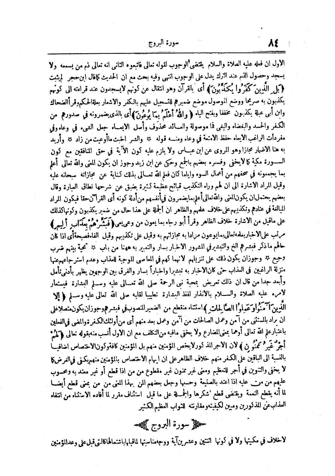 وجوز أن يكون ذلك على تنزيلهم لأنهماكهم في المعاصي الموجبة للعذاب وعدم استرجاعهم عنها منزلة الراغبين في العذاب حتى كان الإخبار به تبشيرا وإخبارا بسار والفرق بين الوجهين يظهر بأدنى تأمل وأبعد جدا من قال إن ذلك تعريض بمحبة نبي الرحمة صلى الله تعالى عليه وسلم البشارة فيستعار لأمره عليه الصلاة و السلام بالإنذار لفظ البشارة تطييبا لقلبه صلى الله تعالى عليه وسلم إلا الذين آمنوا وعملوا الصالحات استثناء منقطع من الضمير لمنصوب في فبشرهم وجوز أن يكون متصلا على أن يراد بالمستثنى من آمنوعمل الصالحات من آمن وعمل بعد منهم أي من أولئك الكفرة والمضي في الفعلين باعتبار علم الله تعالى أو هما بمعنى المضارع ولا يخفى ما فيه من التكلف مع أن الأول أنسب منه بقوله تعالى لهم أجر غير ممنون لأن الأجر المذكور لا يخص المؤمنين منهم بل المؤمنين كافة وكون الأختصاص إضافيا بالنسبة إلى الباقين على الكفر منهم خلاف الظاهر على أن إيهام الأختصاص بالمؤمنين منهم يكفي في الغرض كما لا يخفى والتنوين في أجر للتعظيم ومعنى غير ممنون غير مقطوع من من إذا قطع أو غير معتد به ومحسوب عليهم منمن عليه إذا اعتد بالصليعة وحسبها وجعل بعضهم المن بهذا المعنى من من بمعنى قطع أيضا لما أنه يقطع النعمة ويقتضي قطع شكرها والجملة على ما قيل استئناف مقرر لما أفاده الأستثناء من انتفاء العذاب عن المذكورين ومبين لكيفيته ومقارنته للثواب العظيم الكثير