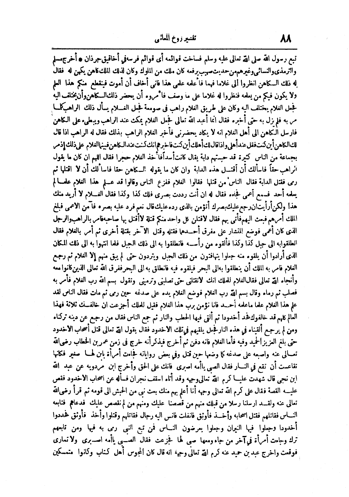 أخرج مسلم والترمذي والنسائي وغيرهم من حديث صهيب يرفعه كان ملك من الملوك وكان لذلك الملك كاهن يكهن له فقالله ذلك الكاهن انظروا إلي غلاما فهما فأعلمه علمي هذا فإني أخاف أن أموت فينقطع منكم هذا العلم ولا يكون فيكم من يعلمه فنظروا له غلاما على ما وصف فأمروه أن يحضر ذلك الكاهن وأن يختلف إليه فجعل الغلام يختلف إليه وكان على طريق الغلام راهب في صومعة فجعل الغلام يسأل ذلك الراهب كلما مر به فلم يزل به حتى أخبره فقال إنما أعبد الله تعالى فجعل الغلام يمكث عند الراهب ويبطيء على الكاهن فأرسل الكاهن إلى أهل الغلام أنهلا يكاد يحضرني فأخبر الغلام الراهب بذلك فقال له الراهب إذا قاللك الكاهن أين كنت فقل عند أهلي وإذا قال أهلك أين كنت فأخبرهم أنك كنت عند الكاهن فبينما الغلام على ذلك إذ مر بجماعة من الناس كثيرة قد حبستهم دابة يقال كانت أسدا فأخذ الغلام حجرا فقال اللهم إن كان ما يقول الراهب حقفا فاسألك أن أقتل هذه الدابة وإن كان ما يقوله الكاهن حقا فاسألك أن لا أقتلها ثم رمى فقتل الدابة فقال الناس من قتلها فقالوا الغلام ففزع الناس وقالوا قد علم هذا الغلام علما لم يعلمه أحد فسمع أعمى فجاءه فقال له إنأنت رددت بصري فلك كذا وكذا فقال الغلام لا أريد منك هذا ولكن أرأيت إن رجع عليك بصرك أتؤمن بالذي رده عليك قال نعم فرد عليه بصره فآمن الأعمى فبلغ الملك أمرهم فبعث إليهم فأتى بهم فقال لأقتلن كل واحد منكم قتلة لا أقتل بها صاحبه فأمر بالراهب والرجل الذي كان أعمى فوضع المنشار على مفرق أحدهما فقتله وقتل الآخر بقتلة أخرى ثم أمر بالغلام فقال انطلقوا به إلى جبل كذا وكذا فألقوه من رأسهفانطلقوا به إلى ذلك الجبل فلما انتهوا به إلى ذلك المكان الذي أرادوا أن يلقوه منه جعلوا يتهافتون من ذلك الجبل ويتردون حتى لم يبق منهم إلا الغلام ثم رجع الغلام فأمر به الملك أن ينطلقوا به إلى البحر فيلقوه فيه فانطلق به إلى البحر ففرق الله تعالى الذين كانوا معه وأنجاه الله تعالى فقال الغلام للملك إنك لا تقتلني حتى تصلبني وترميني وتقول بسم الله رب الغلام فأمر به فصلب ثم رماه وقال بسم الله رب الغلام فوضع الغلام يده على صدغه حين رمى ثم مات فقال الناس لقد علم هذا الغلام علما ما علمه أحد فأنانؤمنبرب هذا الغلام فقيل أجزعت أنخالفك ثلاثة فهذا العالم كلهم قد خالفوك فخذ أخدودا ثم ألقي فيها الحطب والنار ثم جمع الناس فقال من رجع عن دينه تركناه ومن لم يرجع ألقيناه في هذه النار فجعل يلقيهم في تلك الأخدود فقال يقول الله تعالى قتل أصحاب الأخدود حتى بلغ العزيز الحميد وفيه فأما الغلام فإنه دفن ثم أخرج فيذكر أنه خرج في زمن عمر ابن الخطاب رضي الله تعالى عنه وأصبغه على صدغه كما وضعها حين قتل وفي بعض رواياته فجاءت امرأة بابن لها صغير فكانت تقاعست أن تقع في النار فقال الصبي يا أمه اصبري فإنك على الحق وأخرج ابن مردويه عن عبد الله بن نجي قال شهدت عليا كرم الله تعالى وجهه وقد أتاه أسقف نجران فسأله عن أصحاب الأخدود فقص عليه القصة فقال علي كرم الله تعالى وجهه أنا أعلم بهم منك بعث نبي من الحبش إلى قومه ثم قرأ رضي الله تعالى عنه ولقد أرسلنا رسلا من قبلك منهم من قصصنا عليك ومنهم من لم نقصص عليك فدعاهم فتابعه الناس فقاتلهم فقتل أصحابه وأخذ فأوثق فانفلت فانس إليه رجال فقاتلهم وقتلوا وأخذ فأوثق فخددوا أخدودا وجعلوا فيها النيران وجعلوا يعرضون الناس فمن تبع النبي رمى به فيها ومن تابعهم ترك وجاءت امرأة في آخر من جاء ومعها صبي فجزعت فقال الصبي يا أمه اصبري ولا تماري فوقعت وأخرج عبد بن حميد عنه كرم الله تعالى وجهه أنه قال كان المجوس أهل كتاب وكانوا متمسكين
