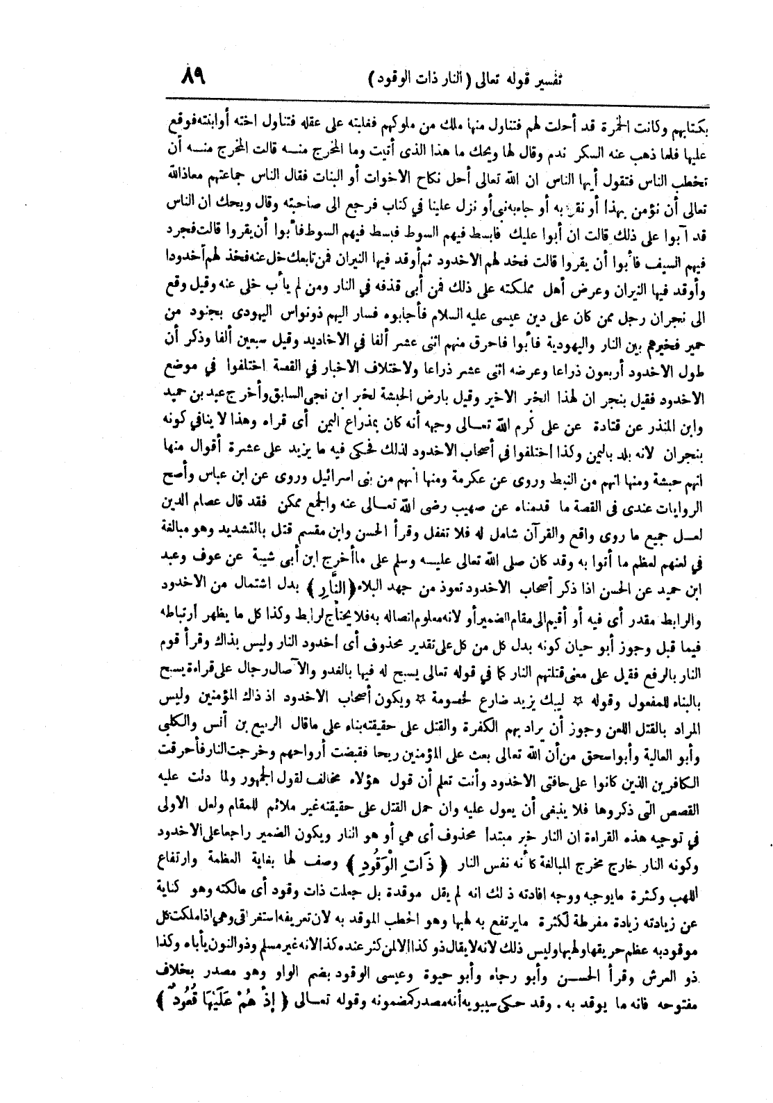 ويكون أصحاب الأخدود إذ ذاك المؤمنين وليس المراد بالقتل اللعن وجوز أن يراد بهم الكفرة والقتل على حقيقته بناء على ما قال الربيع بن أنس والكلبي وأبو العالية وأبو إسحاق من أن الله تعالى بعث على المؤمنين ريحا فقبضت أرواحهم وخرجت النار فأحرقت الكافرين الذين كانوا على حافتي الأخدود وأن تتعلم أن قول هؤلاء مخالف لقول الجمهور ولما دلت عليه القصص التي ذكروها فلا ينبغي أن يعول عليه وإن حمل على حقيقته غير ملائم للمقام ولعل الأولى في توجيه هذه القراءة إن النار مبتدأ محذوف أي هي أو هو النار ويكون الضمير راجعا على الأخدود وكونه النار خارج مخرج المبالغة كأنه نفس النار ذات الوقود وصف لها بعناية العظمة وارتفاع اللهب وكثرة ما يوجبه ووجه إفادته ذلك أنه لم يقل بل موقدة جعلت ذات وقود أي مالكته وهو كناية عن زيادته زيادة مفرطة لكثرة ما يرتفع به لهبها وهو الحطب الموقد به لأن تعريفه استغراقي وهي إذا ملكت كل موقود به عظم حريقها ولهبها وليسذلك لأنه لا يقال ذو كذا إلا لمن كثر عنده كذا لأنه غير مسلم وذو النون وكذا ذو العرش وقرأ الحسن وأبو رجاء وأبو حيوة وعيسى الوقود بضم الواو وهو مصدر بخلاف مفتوحه فإنه ما يوقد به وقد حكى سيبويه أنه مصدر كمضمونه وقوله تعالى إذ هم عليها قعود