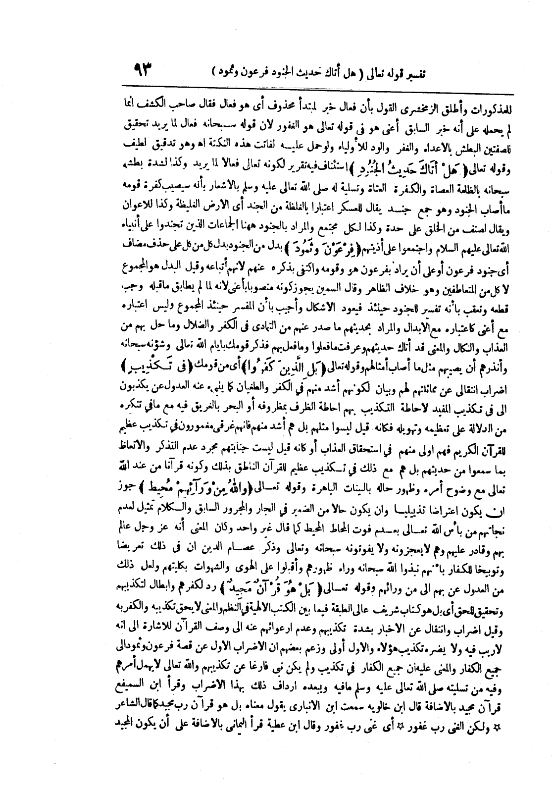 للمذكورات وأطلق الزمخشري القول بأن فعال خبر لمبتدأ محذوف أي هو فعال فقال صاحب الكشف إنما لم يحمله على أنه خبر السابق أعني هو في قوله تعالى هو الغفور لأن قوله سبحانه فعال لما يزيد تحقيق للصفتين البطش بالأعداء والغفر والود للأولياء ولو حمل عليه لفاتت هذه النكتة أه وهو تدقيق لطيف وقوله تعالى هل أتاك حديث الجنود استئناف فيه تقرير لكونه تعالى فعالا لما يريد وكذا اشدة بطشه سبحانه بالظلمة العصاة والكفرة العتاة وتسلية له صلى الله تعالى عليه وسلم بالأشعار بأنه سيصيب كفرة قومه ما أصاب الجنود وهو جمع جند يقال للعسكر اعتبارا بالغلظة من الجند أي الأرض الغليظة وكذا للعوان ويقال لصنف من الخلق على حدة وكذا لكل مجتمع والمراد بالجنود ههنا الجماعات الذين تجندوا على أنبياء الله تعالى عليهم السلام واجتمعوا على أذيتهم فرعون وثمود بدل من الجنود بدل كل من كل على حذف مضاف أي جنود فرعون أو على أن يراد بفرعون هو وقومه واكتفى بذكره عنهم لأنهم أتباعه وقيل البدل هو المجموع لا كل من المتعاطفين وهو خلاف الظاهر وقال السمين يجوز كونه منصوبا بأعني لما لم يطابق ما قبله وجب وتعقب بأنه تفسير للجنود حينئذ فيعود الأشكال وأجيب بأن المفسر حينئذ المجموع وليس اعتباره مع أعني كاعتباره مع الإبدال والمراد بحديثهم ما صدر عنهم من التمادي في الكفر والضلال وما حل بهم من العذاب والنكال والمعنى قد أتاك حديثهم وعرفت ما فعلوا وما فعل بهم فذكر قومك بأيام الله تعالى وشؤنه سبحانه وأنذرهم أن يصيبهم مثل ما أصاب أمثالهم وقوله تعالى بل الذين كفروا أي من قومك في تكذيب إضراب انتقالي عن مماثلتهم لهم وبيان لكونهم أشد منهم في الكفر والطغيان كما ينبيء عنه العدول عن يكذبون إلى في تكذيب المفيد لأحاطة التكذيب بهم إحاطة الظرف بمظروفه أو البحر بالغريق فيه مع ما في تنكيره من الدلالة على تعظيمه وتهويله قيل ليسوا مثلهم بل هم أشد منهم فإنهم غرقى مغمورون في تكذيب عظيم للقرآن الكريم فهم أولى منهم في استحقاق العذاب أو كأنه قيل ليست جنايتهم مجرد عدم التذكر والأتعاظ بما سمعوا من حديثهم بل هم مع ذلك في تكذيب عظيم للقرآن الناطق بذلك وكونه قرآنا من عند الله تعالى مع وضوح أمره وظهور حاله بالبينات الباهرة وقوله تعالى والله من ورائهم محيط جوز أن يكون اعتراضا تذليليا وأن يكون حالا من الضمير في الجار والمجرور السابق والكلام تمثيل لعدم نجاتهم من بأس الله تعالى بعدم فوت المحاط المحيط كما قال غير واحد وكان المعنى أنه عز و جل عالم بهم وقادر عليهم وهم لا يعجزونه ولا يفوتونه سبحانه وتعالى وذكر عصام الدين إن في ذلك تعويضا وتوبيخا للكفار بأنهم نبذوا الله سبحانه وراء ظهورهم وأقبلوا على الهوى والشهوات بكليتهم ولعل ذلك من العدول عن بهم إلى منورائهم وقوله تعالى بل هو قرآن مجيد رد لكفرهم وإبطال لتكذيبهم وتحقيق للحق أي بل هو كتاب شريف عالي الطبقة فيما بين الكتب الإلهية في النظم والمعنى لا يحق تكذيبه والكفر به وقيل إضراب وانتقال عن الأخبار بشدة تكذيبهم وعدم إرعوائهم عنه إلى وصف القرآن للإشارة إلى أنه لا ريب فيه ولا يضره تكذيب هؤلاء والأول أولى وزعم بعضهم أن الإضرابالأول عن قصة فرعون وثمود إلى جميع الكفار والمعنى عليه أن جميع الكفار في تكذيب ولم يكن نبي فارغا عن تكذيب والله تعالى لا يمهل أمرهم وفيه من تسليته صلى الله تعالى عليه وسلم ما فيه ويبعده إرداف ذلك بهذا الإضراب وقرأابن السمقيع قرآن مجيد بالإضافة قال ابن خالويه سمعت ابن الأنباري يقول معناه بل هو قرآن رب مجيد كما قال الشاعر