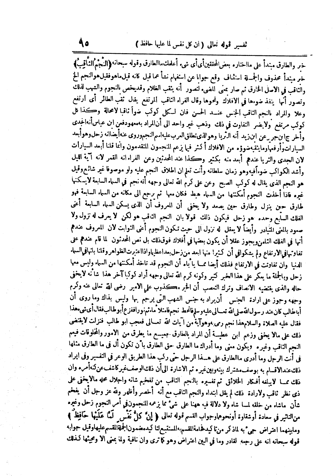 خبر والطارق مبتدأ على ما اختاره بعض المحققين أي أي شيء أعلمك ما الطارق وقوله سبحانه النجم الثاقب خبر مبتدأ محذوف والجملة استئناف وقع جوابا عن استفهام نشأ عما قبل كأنه قيل ما هو فقيل هو النجم الخ والثاقب في الأصل الخارق ثم صار بمعنى المضيء لتصور أنه يثقب الظلام وقد يخص بالنجوم والشهب لذلك وتصور أنها ينفذ ضوءها في الأفلاك ونحوها وقال الفراء الثاقب المرتفع يقال ثقب الطائر أي ارتفع وعلا والمراد بالنجم الثاقب الجنس عند الحسن فإن لكل كوكب ضوأ ثاقبا لا محالة وكذا كل كوكب مرتفع ولا يضر التفاوت في ذلك وذهب غير واحد إلى أن المراد به معهود فعن ابن عباس أنه الجدي وأخرج ابن جرير عن ابن زيد أنه الثريا وهو الذي تطلق العرب عليه اسم النجم وروي عنه أيضا أنه زحل وهو أبعد السيارات وأرفعها وما يثقبه ضوؤه من الأفلاك أكثر فيما يزعم أكثر فيما يزعم المنجمون المتقدمون وإنما قلنا أبعد السيارات لأن الجدي والثريا عندهم أبعد منه بكثير وكذا عند المحدثين وعن الفراء أنه القمر لأنه آية الليل وأشد الكواكب ضوءا فيه وهو زمان سلطانه وأنت تعلم أن إطلاق النجم عليه ولو موصوفا غير شائع وقيل هو النجم الذي يقال له كوكب الصبح وعن علي كرم الله تعالى وجهه أنه نجم السماء السابعة لا يسكنها فميره فإذا أخذت النجوم أمكنتها من السماء هبط فكان معها ثم يرجع إلى مكانه من السماء السابعة فهو طارق حين ينزل وطارق حين يصعد ولا يخفى أن المعروف أن الذي يسكن السماء السابعة أعني الفلك السابع وحده هو زحل فيكون ذلك قولا بأن النجم الثاقب هو لا يعرف له نزول ولا صعود بالمعنى المتبادر وأيضا لا يعقل له نزول إلى حيث تكون النجوم أعني الثوابت لأن المعروف عندهم أنها في الفلك الثامن ويجوز عقلا أن يكون بعضها في أفلاك فوق ذلك بل نص المحدثون لما قام عندهم على تفاوتها في الأرتفاع ولم يشكوا في أن كثيرا منها من زحل بعدا عظيما وإذا اعتبرت الظواهر وقلنا بأنها في السماء الدنيا وإن تفاوتت في الأرتفاع فذلك أيضا مما يأباه أن النجوم قد تأخذ أمكنتها من السماء وليس معها زحل وبالجملة ما يعكر على هذا الخبر كثير وكونه كرم الله تعالى وجهه أراد كوكبا آخر هذا شأنه لا يخفى حاله والذي يقتضيه الأنصاف وترك التعصب أن الخبر مكذوب على المير رضي الله تعالى عنه وكرم وجهه وجوز على إرادة الجنس أن يراد به جنس الشهب التي يرجم بها وليس بذاك وما روي أن أبا طالب كان عند رسول الله صلى الله تعالى عليه وسلم فانحط نجم فامتلأ ماء ثم نور ففزع أبو طالب فقال أي شيء هذا فقال عليه الصلاة و السلام هذا نجم رمى به وهو آية من آيات الله تعالى فعجب أبو طالب فنزلت لا يقتضي ذلك على ما لا يخفى وزعم ابن عطية أن المراد بالطارق جميع ما يطرق من الأمور والمخلوقات فيعم النجم الثاقب وغيره ويكون معنى وما أدراك ما الطارق حق الطارق بأن تكون أل في ما الطارق مثلها في أنت الرجل وما أدري ما الطارق على هذا الرجل حتى ركب هذا الطريق الوعر في التفسير وفي إيراد ذلك عند الإقسام به بوصف مشترك بينه وبين غيره ثم الإشارة إلى أن ذلك الوصف غير كاشف عن كنه أمره وإن ذلك مما لا يبلغه أفكار الخلائق ثم تفسيره بالنجم الثاقب من تفخيم شأنه وإجلال محله ما لا يخفى على ذي نظر ثاقب ولارادة ذلك لم يقل ابتداء والنجم الثاقب مع أنه أخصر وأظهر ولله عز و جل أن يفخم شأ ما شاء من خلقه لما شاء ولا دلالة فيه ههنا على شيء مما يزعمه المنجمون في أمر النجوم زحل وغيره من التأثير في سعادة أو شقاوة أو نحوهما وجواب القسم قوله تعالى إن كل نفس لما عليها حافظ وما بينهما اعتراض جيء به لما ذكر من تأكيد فخامة المقسم به المستتبع لتأكيد مضمون الجملة المقسم عليها وقيل جوابه قوله سبحانه إنه رجعه لقادر وما في البين اعتراض وهو كما ترى وإن نافية ولما بمعنى إلا ومجيئها كذلك