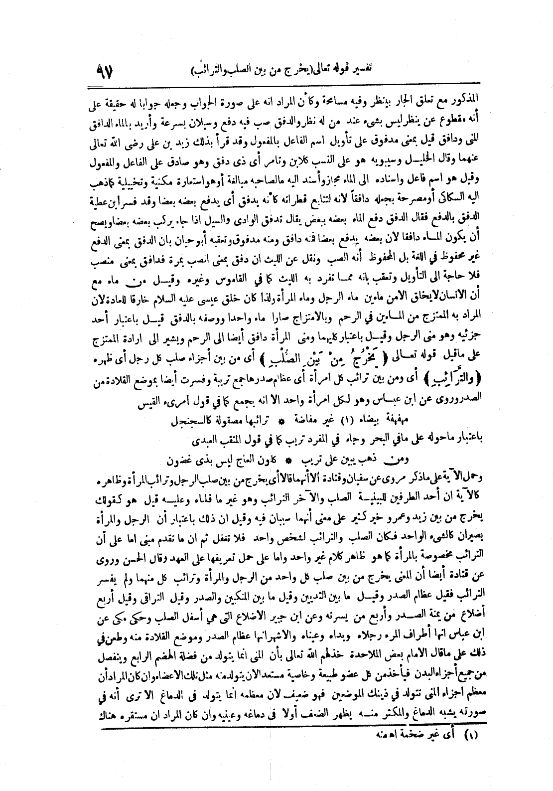 المذكور مع تعلق الجار بينظر وفيه مسامحة وكأن المراد أنه على صورة الجواب وجعله جوابا له حقيقة على أنه مقطوع عن ينظر بشيء عند من له نظر والدفق صب فيه دفع وسيلان بسرعة وأريد بالماء الدافق المني ودافق قيل بمعنى مدفوق على تأويل اسم الفاعل بالمفعول وقد قرأ بذلك زيد بن علي رضي الله تعالى عنهما وقال الخليل وسيبويه هو على النسب كلا بن وتامر أي ذي دفق وهو صادق على الفاعل والمفعول وقيل هو اسم فاعل وإسناده إلى الماء مجاز وأسند إليه ما لصاحبه مبالغة أو هو استعارة مكنية وتخييلية كما ذهب إليه السكاكي و مصرحة بجعله دافقا لأنه لتتابع قطراته كأنه يدفق أي يدفع بعضه بعضا وقد فسر ابن عطية الدفق بالدفع فقال الدفق دفع الماء بعضه ببعض يقال تدفق الوادي والسيل إذا جاء يركب بعضه بعضا ويصح أن يكون الماء دافقا لأن بعضه يدفع بعضا فمنه دافق ومنه مدفوق وتعقبه أبو حيان بأن الدفق بمعنى الدفع غير محفوظ في اللغة بل المحفوظ أنه الصب ونقل عن الليث أن دفق بمعنى انصب بمرة فدافق بمعنى منصب فلا حاجة إلى التأويل وتعقب بأنه مما تفرد به الليث كما في القاموس وغيره وقيل من ماء مع أن الإنسان لا يخلق إلا من ماءين ماء الرجل وماء المرأة ولذا كان خلق عيسى عليه السلام خارقا للعادة لأن المراد به الممتزج من الماءين في الرحم وبالأمتزاج صارا ماء واحدا ووصفه بالدفق قيل باعتبار أحد جزئيه وهو مني الرجل وقيل باعتبار كليهما ومني المرأة دافق أيضا إلى الرحم ويشير إلى إرادة الممتزج على ما قيل قوله تعالى يخرج من بين الصلب أي منبين أجزاء صلب كل رجل أي ظهره والترائب أيومنبين ترائب كل امرأة أيعظام صدرها جمع تريبة وفسرت أيضا بموضع القلادة من الصدر وروي عن ابن عباس وهو لكل امرأة واحد إلا أنه يجمع كما في قول امريء القيس مهفهفة بيضا غير مفاضة