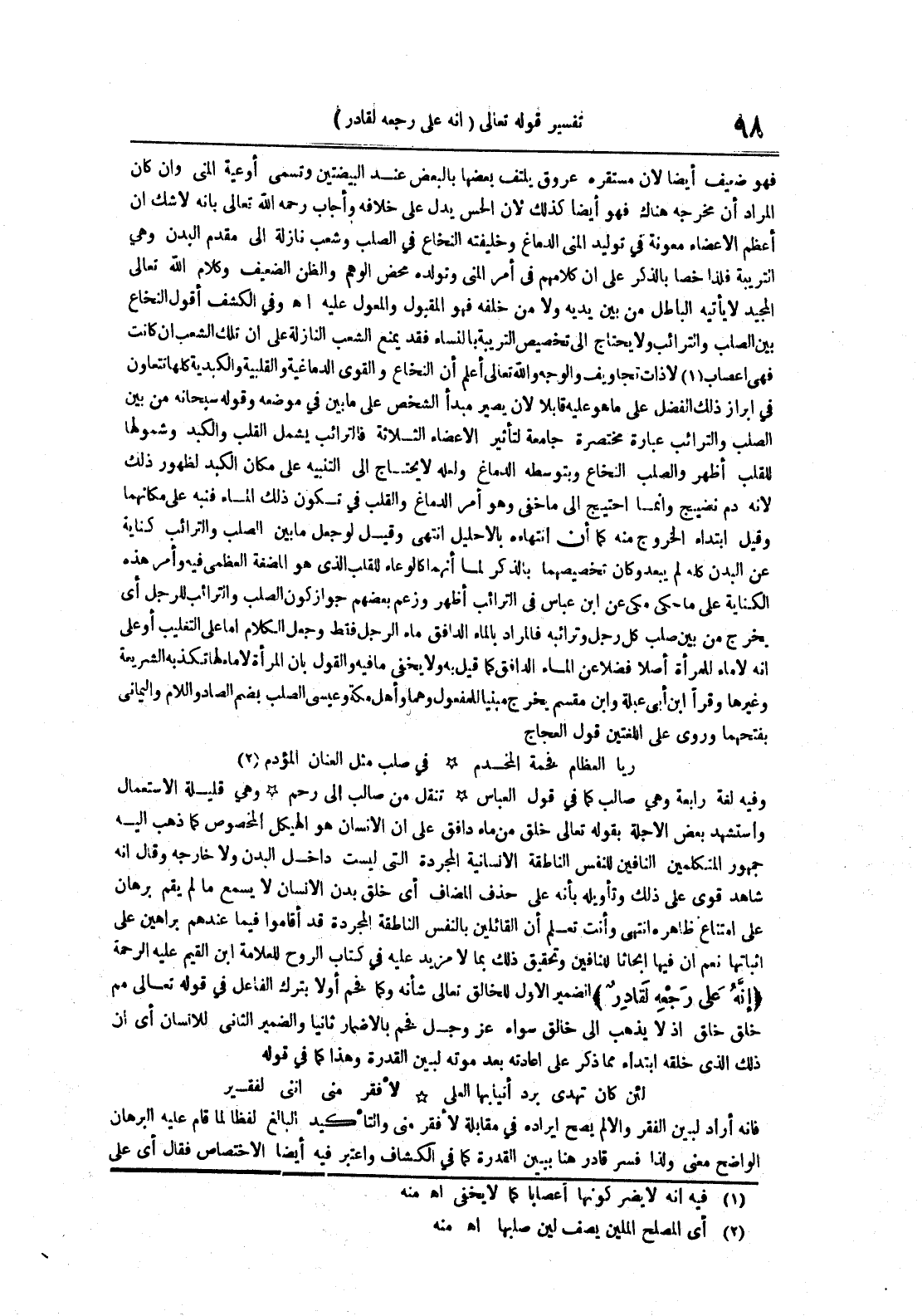 وهي قليلة الأستعمال واستشهد بعض الأجلة بقوله تعالى خلق من ماء دافق على أن الإنسان هو الهيكل المخصوص كما ذهب إليه جمهور المتكلمين النافين للنغس الناطقة الإنيانية المجردة التي ليست داخل البدن ولا خارجه وقال أنه شاهد قوي على ذلك وتأويله بأنه على حذف المضاف أي خلق بدن الإنسان لا يسمع ما لم يقم برهان على امتناع ظاهره انتهى وأنت تعلم أن القائلين بالنفس الناطقة المجردة قد أقاموا فيما عندهم براهين على إثباتها نعم إن فيها أبحاثا للنافين وتحقيق ذلك بما لا مزيد عليه في كتاب الروح للعلامة ابن القيم عليه الرحمة إنه على رجعه لقادر الضمير الأول للخالق تعالى شأنهوكما فخم أولا بترك الفاعل في قوله تعالى مم خلق خلق إذ لا يذهب إلى خالق شواه عز و جل فخم بالإضمار ثانيا والضمير الثاني للإنسان أي إن ذلك الذي خلقه ابتداء مما ذكر على إعادته بعد موته لبين القدرة وهذا كما في قوله لئن كان تهدي برد أنيابها العلى