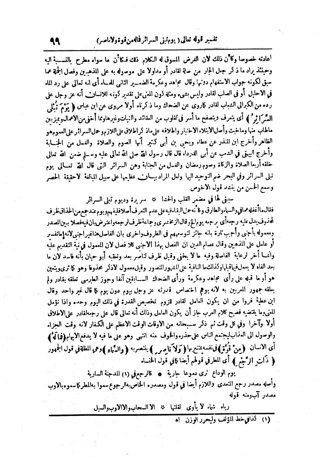 سريرة وديوم تبلى السرائر فقال ما أغفله عما في السماء والطارق وكأنه حمل البقاء فيه على التعرف أصلا فليفهم ويوم عند جمع من الحذاق ظرف لمحذوف يدل عليه أي يرجعه يوم الخ وقال الزمخشري وجماعة ظرف لرجعه واعترض بأن فيه فصلا ومعموله بأجنبي وأجيب تارة بأنه جائز لتوسعهم في الظروف وأخرى بأن الفاصل هنا غير أجنبي لأنه إما تفسير أو عامل على المذهبين وقال عصام الدين إن الفصل بهذا الأجنبي كلا فصل لأن المعمول في نية التقديم عليه وإنما أخر لرعاية الفاصلة وفيه ما لا يخفى وقيل ظرف لناصر بعد وتعقبه أبو حيان بأنه فاسد لأن ما بعد الفاء لا يعمل فيما قبلها وكذلك ما النافية على المشهور المنصور وقيل معمول لا ذكر محذوفا وهو كما ترى ويتعين هو أو ما قبله على رأي مجاهد وعكرمة ورأي الضحاك السابقين آنفا وجوز الطبرسي تعلقه بقادر ولم يعلقه جمهور المعربين به لأنه يوهم اختصاص قدرته عز و جل بيوم دون يوم كما قال غير واحد وقال ابن عطية فروا من أن يكون العامل لقادر للزوم تخصيص القدرة في ذلك اليوم وحده وإذا تؤمل المعنى وما يقتضيه فصيح كلام العرب جاز أن يكون العامل وذلك أنه تعالى قال على رجعه لقادر على الإطلاق أو وآخرا وفي كل وقت ثم ذكر سبحانه من الأوقات الوقت الأعظم على الكفار لأنه وقت الجزاء والوصول إلى العذاب ليجتمع الناس على حذره والخوف منه انتهى وهو على ما فيه لا يدفع الإيهام فما له أي الإنسان منقوة في نفسه يمتنع بها ولا ناصر ينتصر به والسماء وهي المظلة في قول الجمهور ذات الرجع أيالمطر في قولهم أيضا كما في قول الخنساء يوم الوداع ترى دموعا جارية