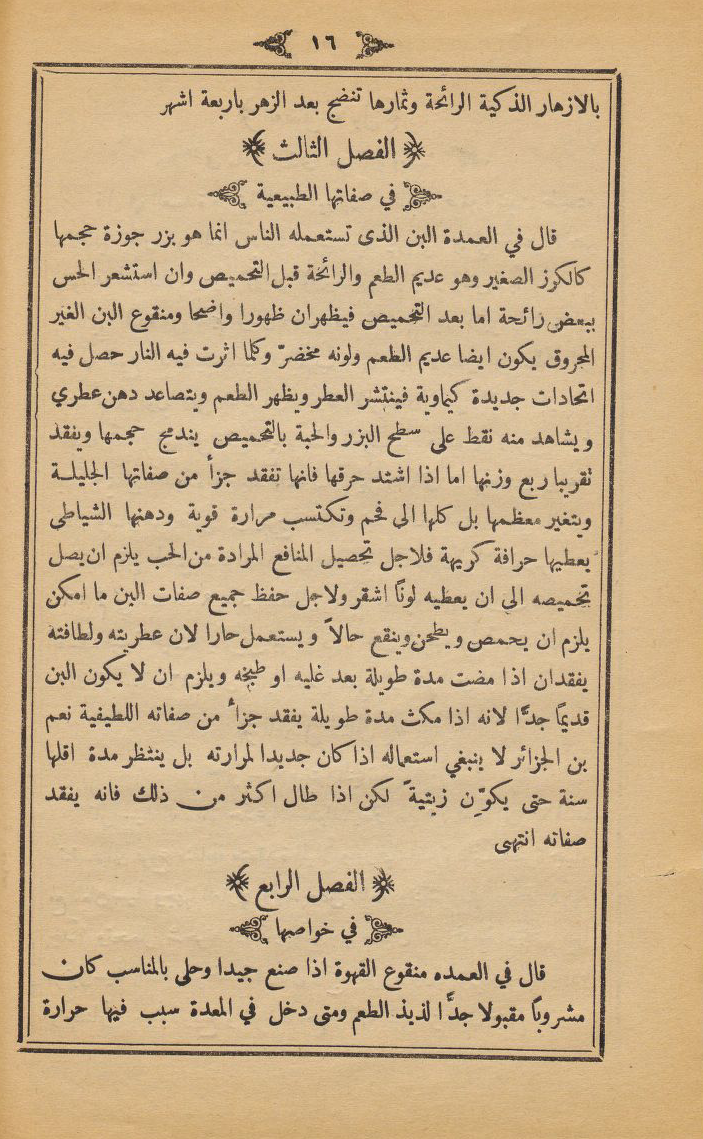 قال في العمدة منقوع القهوة اذا صنع جيدا وحلى بالمناسب كان مشروباً مقبولا جداً لذيذ الطعم ومتى دخل في المعدة سبب فيها حرارة