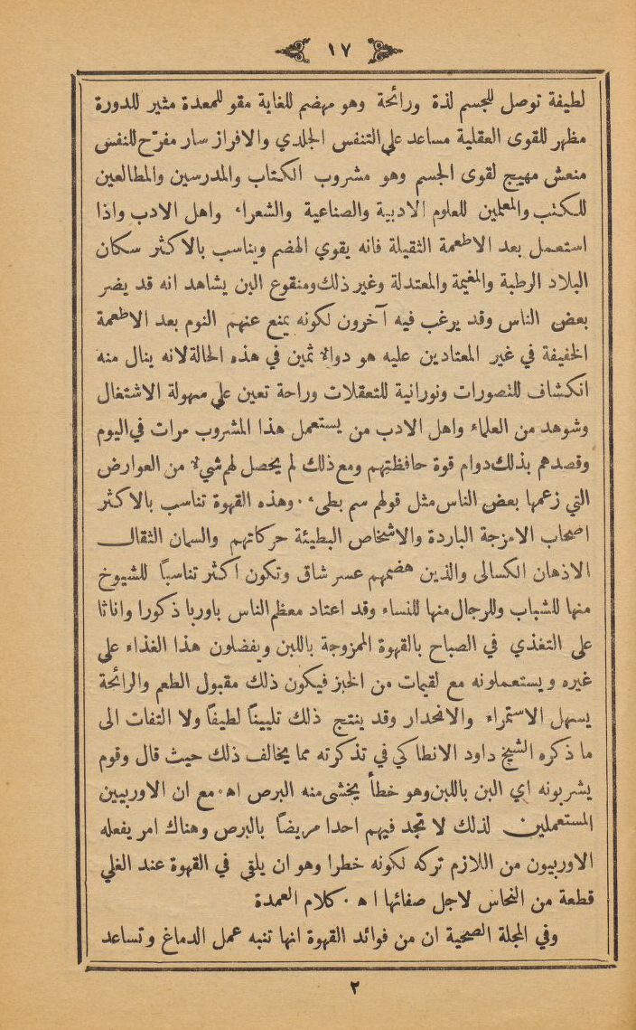 لطيفة توصل للجسم لذة ورائحة وهو مهضم للغاية مقو للمعدة مثير للدورة مظهر للقوى العقلية مساعد على التنفس الجلدي والافراز سار مفرح للنفس منعش مهيج لقوى الجسم وهو مشروب الكتاب والمدرسين والمطالعين للكتب والمعلمين للعلوم الادبية والصناعية والشعراء واهل الادب واذا استعمل بعد الاطعمة الثقيلة فانه يقوي الهضم ويناسب بالاكثر سكان البلاد الرطبة والمغيمة والمعتدلة وغير ذلك ومنقوع البن يشاهد انه قد يضر بعض الناس وقد يرغب فيه آخرون لكونه يمنع عنهم النوم بعد الاطعمة الخفيفة في غير المعتادين عليه هو دواءٌ ثمين في هذه الحالة لانه ينال منه انكشاف للتصورات ونورانية للتعقلات وراحة تعين على سهولة الاشتغال وشوهد من العلماء واهل الادب من يستعمل هذا المشروب مرات في اليوم وقصدهم بذلك دوام قوة حافظتهم ومع ذلك لم يحصل لهم شيءٌ من العوارض التي زعمها بعض