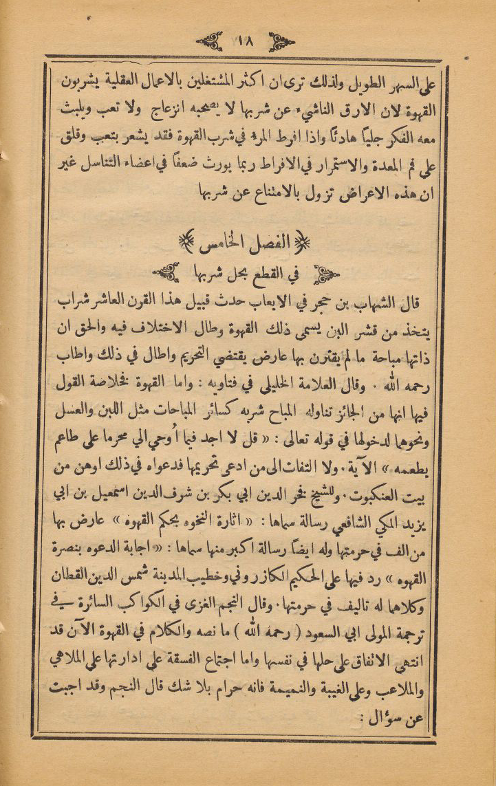 قال الشهاب بن حجر في الايعاب حدث قبيل هذا القرن العاشر شراب يتخذ من قشر البن يسمى ذلك القهوة وطال الاختلاف فيه والحق ان ذاتها مباحة مالم يقترن