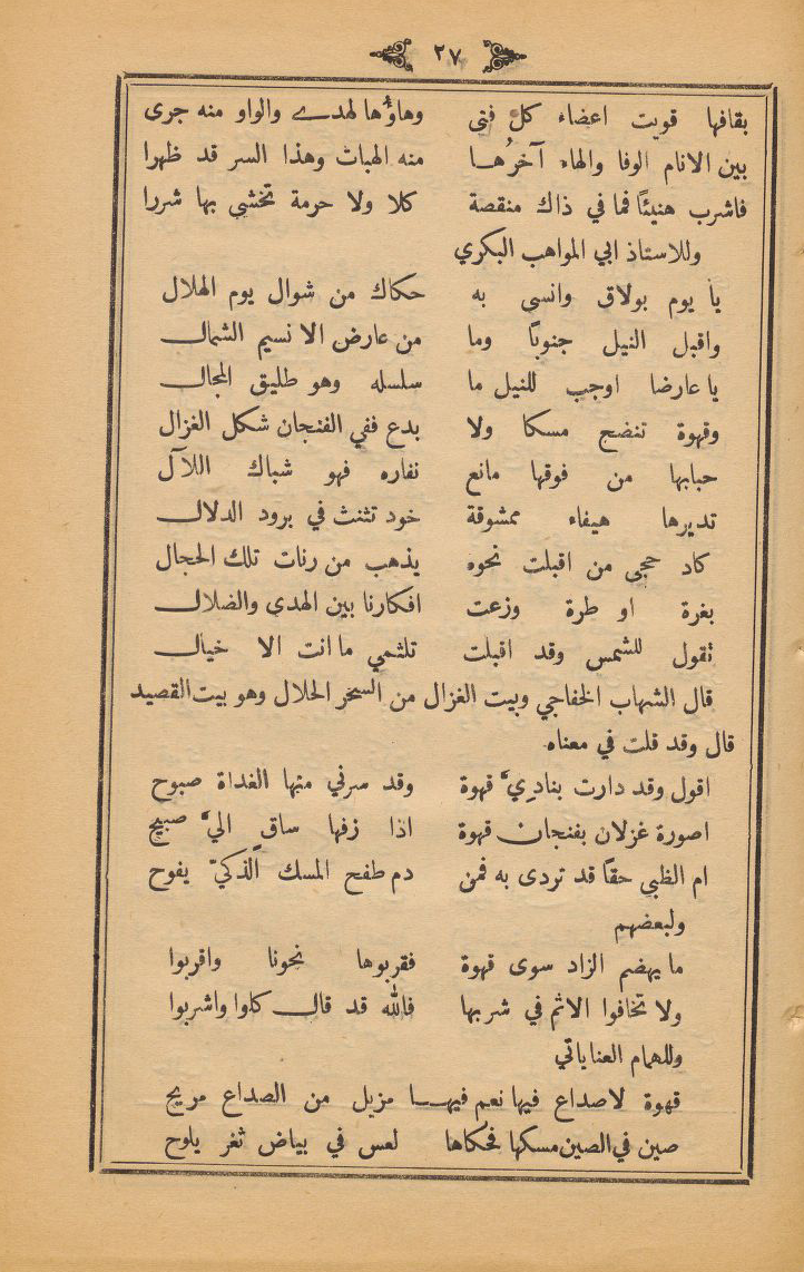 وقهوة تنضج مسكا ولا ... بدع ففي الفنجان شكل الغزال