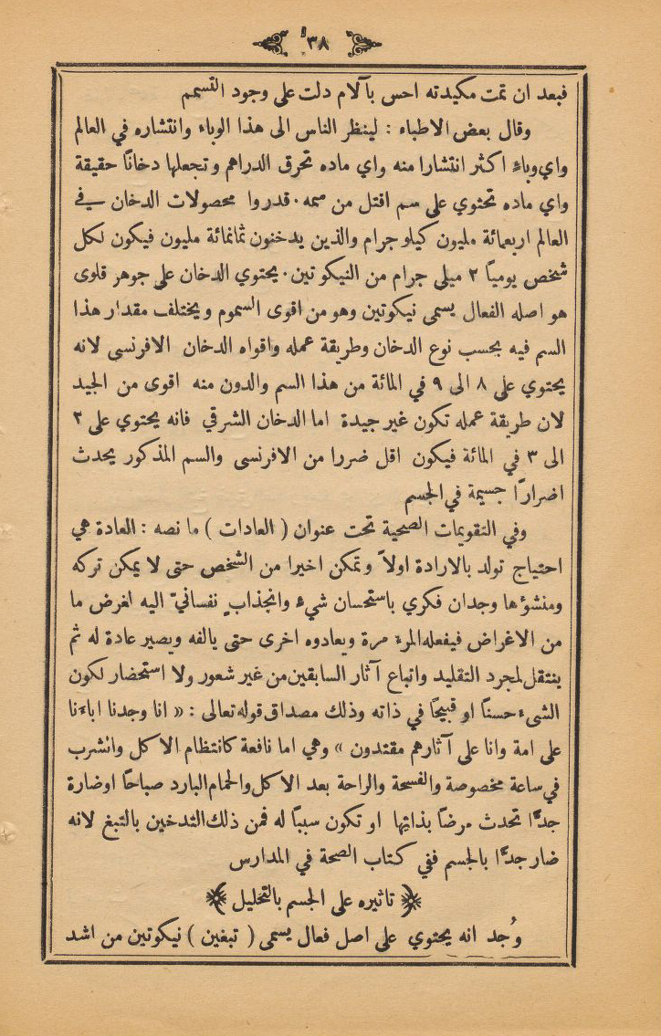 وفي التقويمات الصحية تحت عنوان (العادات) ما نصه: العادة هي احتياج تولد بالارادة اولاً وتمكن اخيرا من الشخص حتى لايمكن تركه ومنشؤها وجدان فكري باستحسان شيءٍ وانجذابٍ نفساني اليه لغرض ما من الاغراض فيفعله المرء مرة ويعادوه اخرى حتى يالفه ويصير عادة له ثم ينتقل لمجرد التقليد واتباع آثار السابقين من غير شعور ولا استحضار لكون الشيءَ حسناً او قبيحاً في ذاته وذلك مصداق قوله تعالى: (انا وجدنا اباءَنا على امة وانا على آثارهم مقتدون) وهي اما نافعة كانتظام الاكل والشرب في ساعة مخصوصة والفسحة والراحة بعد الاكل والحمام البارد صباحاً او ضارة جداً تحدث مرضاَ بذاتها او تكون سبباً له فمن ذلك التدخين بالتبغ لانه ضار جداً بالجسم ففي كتاب الصحة في المدارس.