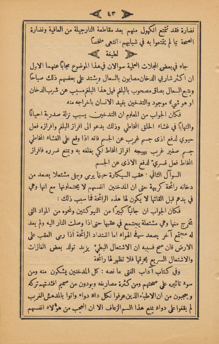 وفي كتاب آداب الفتى ما نصه: كل المدخنين يشكون منه ومن سوءِ تأثيره على صحتهم ومن كثرة مصاريفه ويودون من صميم افئدتهم تركه ويعجبون من ان الاطباء الذي عرفوا لكل داءٍ دواءِ واتوا بالمدهش الغريب لم يقفوا على دواءٍ يمنع هذا السم الزعاف الا ان العجب من هؤُلاءِ انفسهم