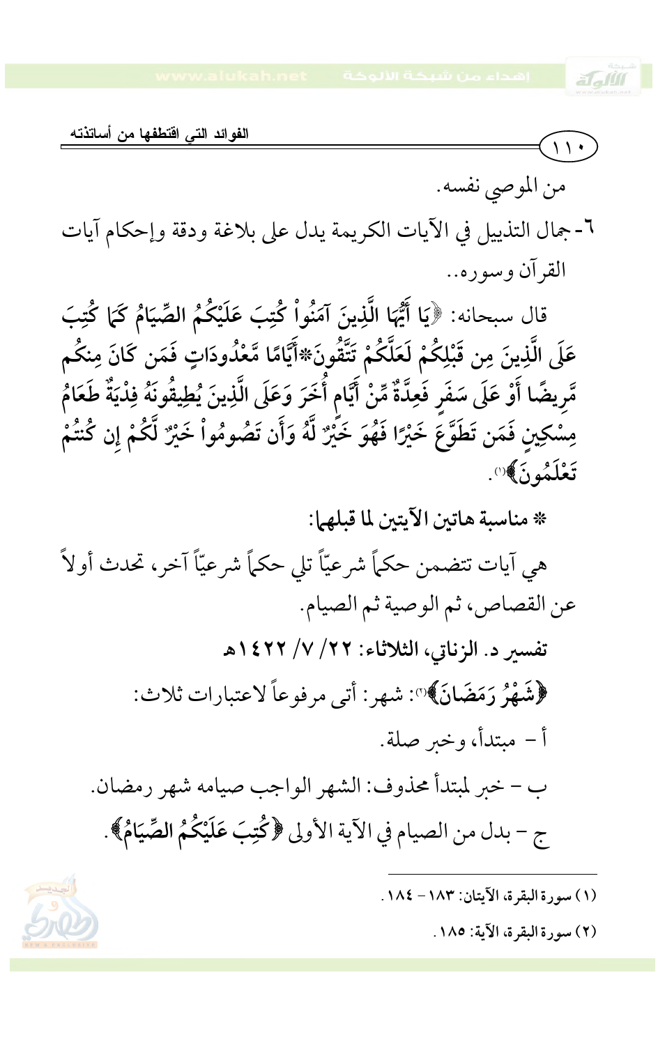 * بين كلمة {الْيُسْرَ}، و {الْعُسْرَ} محسِّنان بديعيان: جناس وطباق، وبين {يُرِيدُ الله بِكُمُ الْيُسْرَ}، {وَلاَ يُرِيدُ بِكُمُ الْعُسْرَ}: مقابلة.