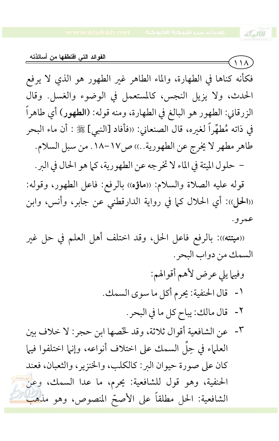 وقد أجاب الأحناف عن قوله: ((الحل ميتته)) بأن المراد من الميتة السمك لا غيره. بدليل حديث ابن عمر رَضْيَ اللَّهُ عَنْهُمَا قال: قال رسول الله - صلى الله عليه وسلم -: ((أحلت لنا ميتتان ودمان .. )) (¬2) الحديث.