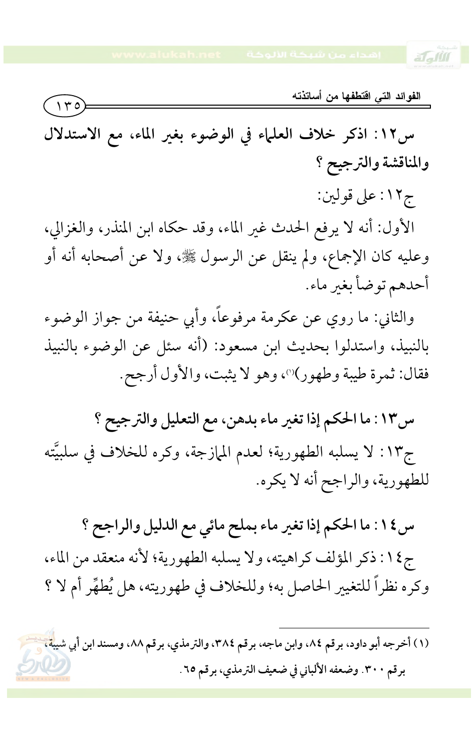 س18: ما حكم الوضوء بالماء الآجن، أو بماء تغير بمكثه، مع ذكر