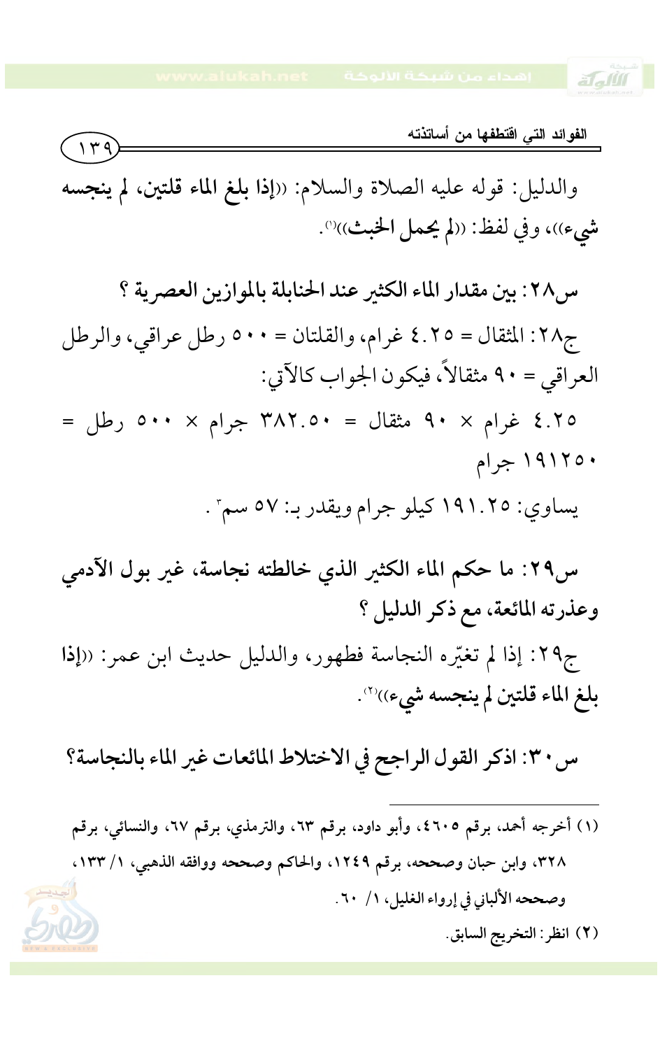 س32: ما حكم الماء الذي يشقّ نزحه إذا خالطه البول، أو العذرة المائعة مع الدليل؟