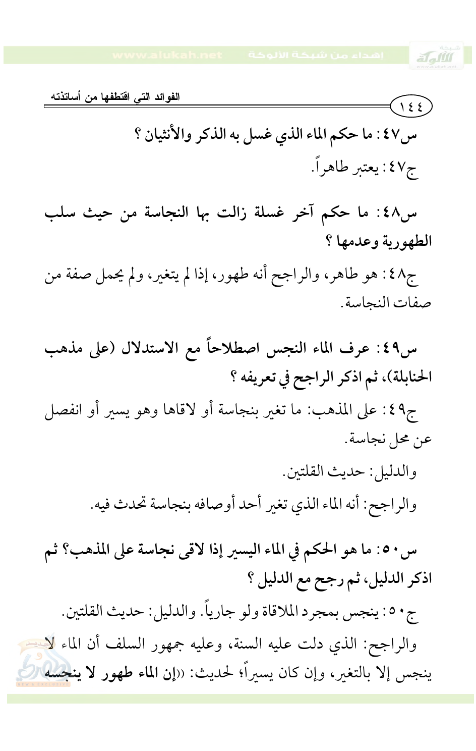 س54: ما حكم الماء النجس الكثير إذا زال تغيره بنفسه مع العلة؟