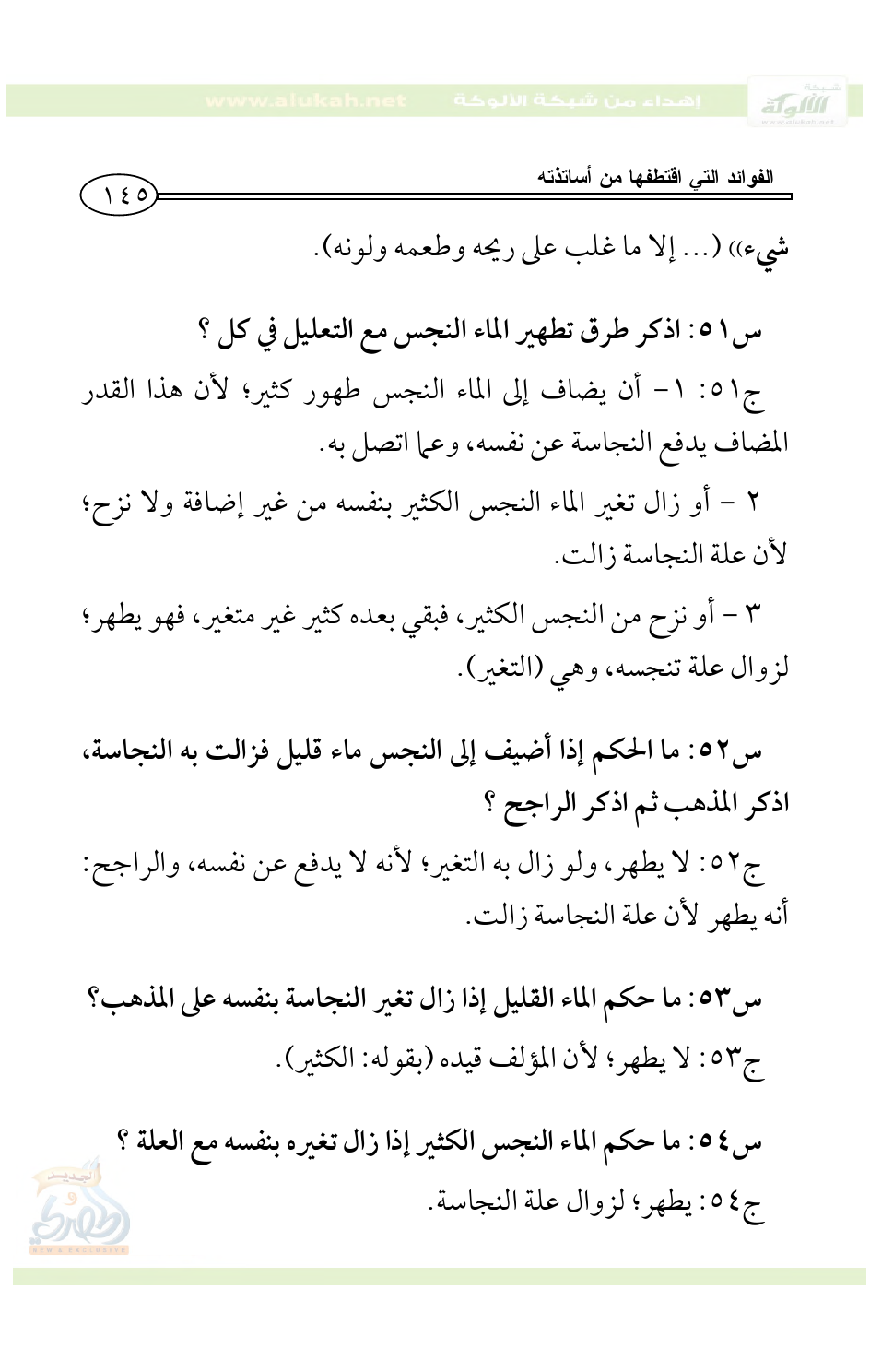 س57: ما هو الحكم إذا نزح من الماء فبقي بعده كثير غير متغير على المذهب مع التعليل؟