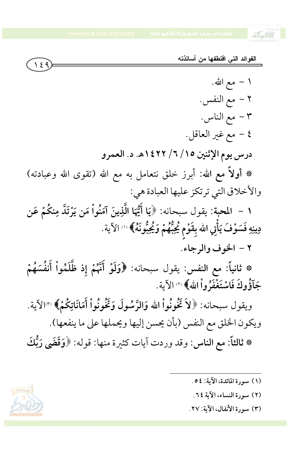 * رابعاً: التعامل مع غير العاقل: من ذلك في الحديث: ((دخلت النار امرأة في هرة، لا هي أطعمتها ولا سقتها ولا تركتها تأكل من خشاش الأرض)) (¬4). أو كما قال عليه الصلاة والسلام، وكما جاء في قصة الرجل الذي سقى الكلب فشكر الله له، فأدخله الجنة (¬5). وفي حديث أبي رقية: ((وإذا ذبحتم فأحسنوا الذبحة .. )) (¬6).