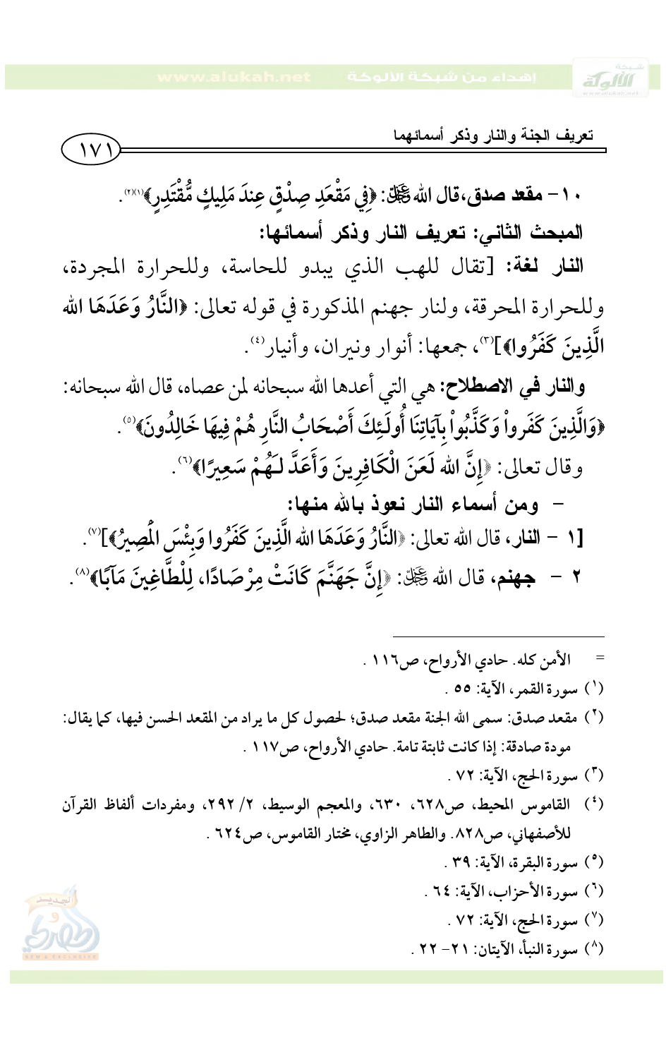 (¬6) وقال الله تعالى: {أَلَمْ تَرَ إِلَى الَّذِينَ بَدَّلُواْ نِعْمَةَ الله كُفْرًا وَأَحَلُّواْ قَوْمَهُمْ دَارَ الْبَوَارِ، جَهَنَّمَ يَصْلَوْنَهَا وَبِئْسَ الْقَرَارُ} [إبراهيم: 28، 29] قال ابن كثير رحمه الله في تفسير القرآن العظيم، 2/ 539: ((وأما دار البوار فهي جهنم))، وأشار إلى ذلك الإمام البغوي رحمه الله في تفسيره، 3/ 53.