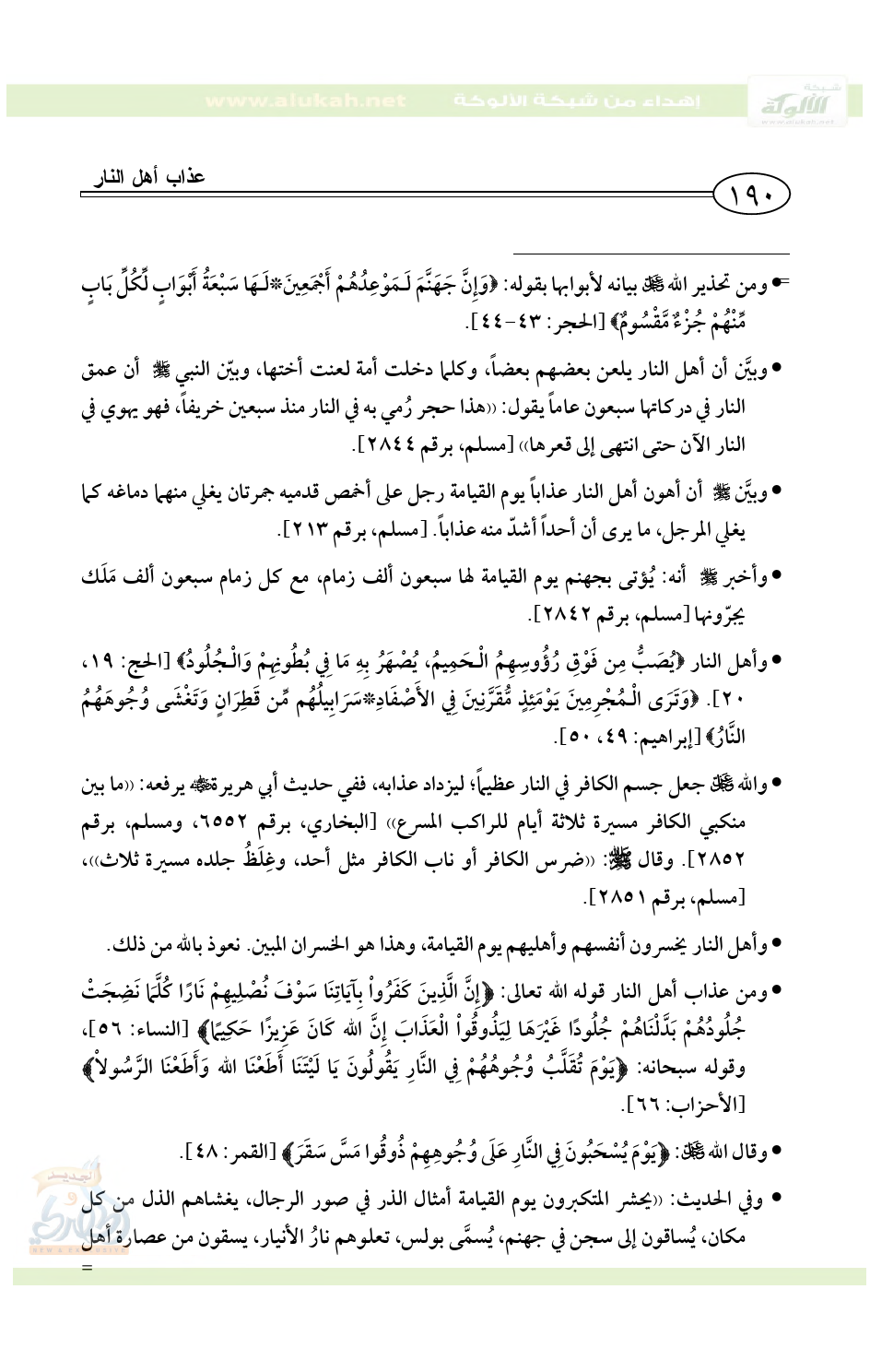 (¬3) ولا شك أن عذاب النار أكثر الله من ذكره في كتابه، وبيّنه رسوله - صلى الله عليه وسلم - إنذاراً للناس، وتحذيراً لهم، قال الله تعالى: {فَاتَّقُواْ النَّارَ الَّتِي وَقُودُهَا النَّاسُ وَالْحِجَارَةُ أُعِدَّتْ لِلْكَافِرِينَ} [البقرة: 24]. وقال تعالى: {فَأَنذَرْتُكُمْ نَارًا تَلَظَّى*لا يَصْلاهَا إِلا الأَشْقَى*الَّذِي كَذَّبَ وَتَوَلَّى} [الليل: 14 - 16]. والنبي - صلى الله عليه وسلم - أنذر وحذّر من النار، ومن ذلك قوله: ((أنا آخذ بحُجَزكم عن النار، هلمَّ عن النار هلمَّ عن النار، فتغلبوني تقحمون فيها)) [مسلم، 2284].