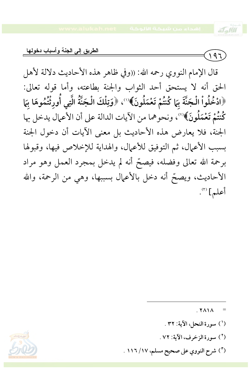 (¬2) مسلم، كتاب صفات المنافقين، باب لن يدخل الجنة أحد بعمله بل برحمة الله تعالى، برقم 2816.