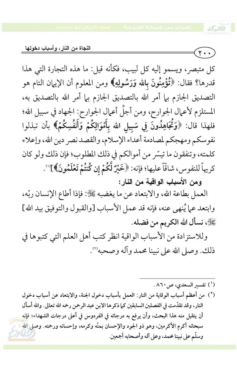 [قال العلامة السعدي رحمه الله في تفسير هاتين الآيتين الكريمتين: ((هذه وصيّة، ودلالة وإرشاد، من أرحم الراحمين لعباده المؤمنين؛ لأعظم تجارة، وأجلّ مطلوب، وأعلى مرغوب، يحصل بها النجاة من العذاب الأليم، والفوز بالنعيم المقيم، وأتى بأداة العرض الدالة على أن هذا أمر يرغب فيه