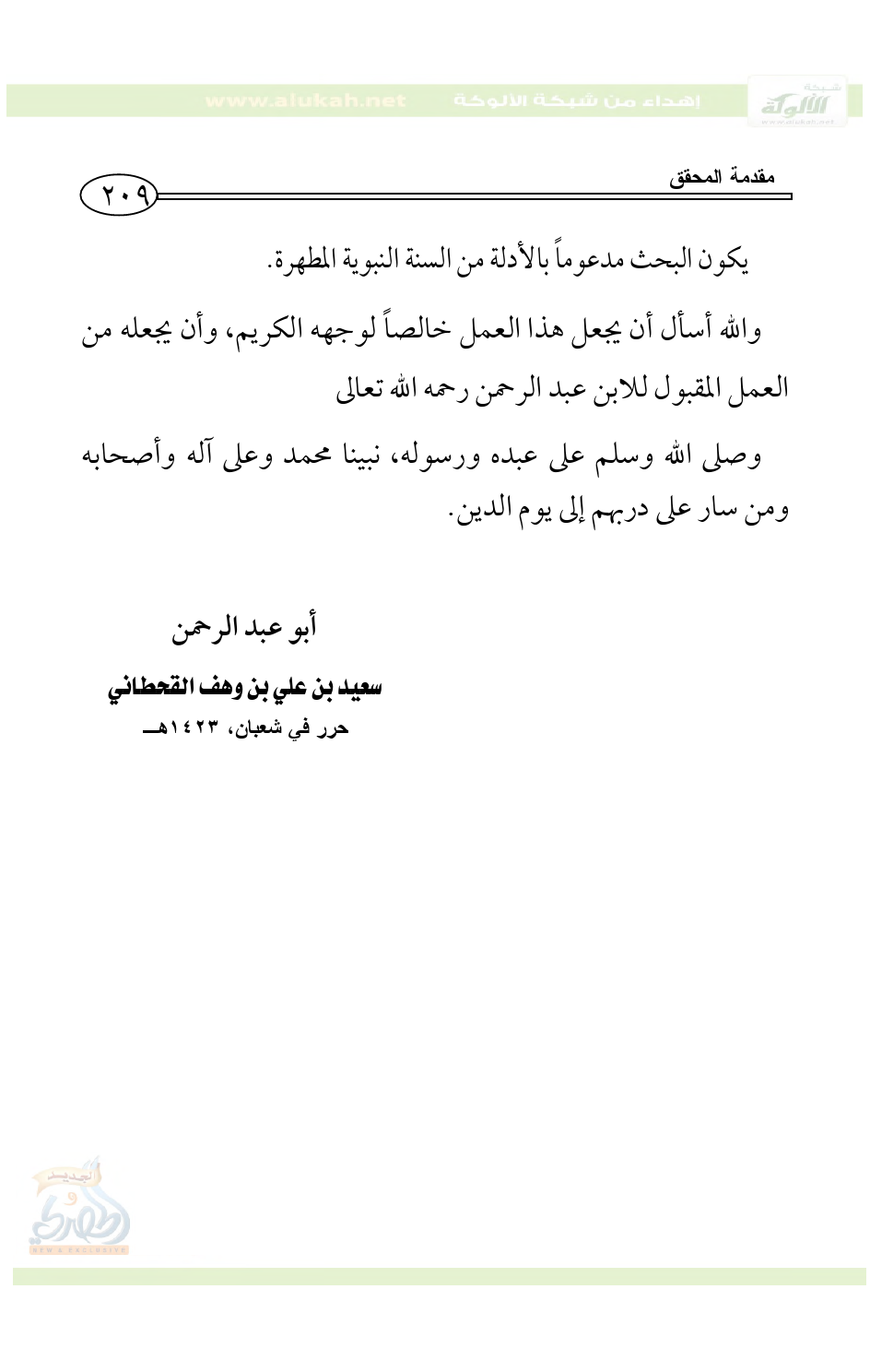 وعندما رأيت هذا الترتيب الجميل، والاختصار المفيد؛ ولأهمية الموضوع، أحببت أن أعتني بإخراج هذه الرسالة التي أسأل الله بوجهه الكريم أن ينفع بها الابن عبد الرحمن، وأن يجعلها له من العمل الذي لا ينقطع، وأن يبلّغه وشقيقه عبد الرحيم منازل الشهداء؛ فإنه ـ الكريم، الرؤوف الرحيم، ذو الفضل والجود والإحسان والامتنان.