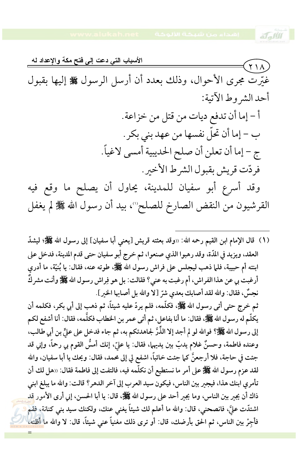 (¬1) انظر: السيرة النبوية لابن هشام، 4/ 46 - 47، ط مكتبة المنار، والفصول في سيرة الرسول - صلى الله عليه وسلم -، لابن كثير، ص173، ط مكتبة المعارف، وط دار الصفا، ص122، وفتح الباري بشرح صحيح البخاري لابن حجر، 7/ 519 - 520، ط مكتبة المعارف، دار الفيحاء، وزاد المعاد لابن قيم الجوزية، 3/ 395، ط مؤسسة الرسالة.