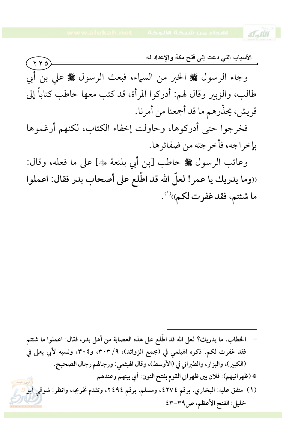 يا رسول الله، أمكني من حاطب، فإنه قد كفر، فأضرب عنقه، فقال رسول الله - صلى الله عليه وسلم -: يا ابن الخطاب، ما يدريك؟ لعل الله قد اطّلع على هذه العصابة من أهل بدر، فقال: اعملوا ما شئتم فقد غفرت لكم. ذكره الهيثمي في (مجمع الزوائد)، 9/ 303، و304، ونسبه لأبي يعلى في (الكبير)، والبزار، والطبراني في (الأوسط)، وقال الهيثمي: ورجالهم رجال الصحيح.