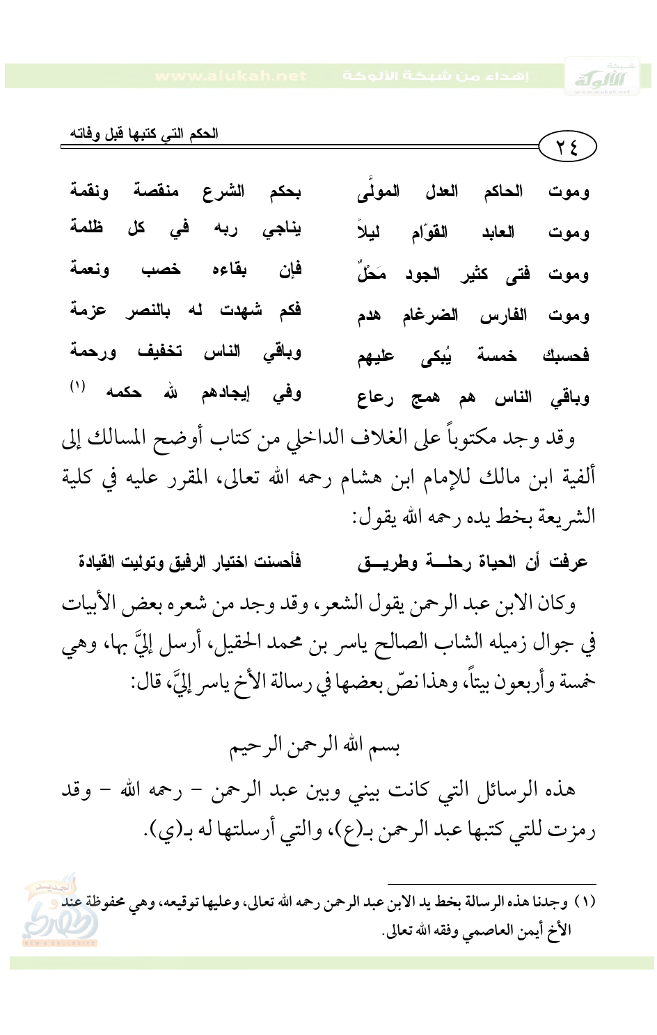 (¬1) وجدنا هذه الرسالة بخط يد الابن عبد الرحمن رحمه الله تعالى، وعليها توقيعه، وهي محفوظة عند الأخ أيمن العاصمي وفقه الله تعالى.